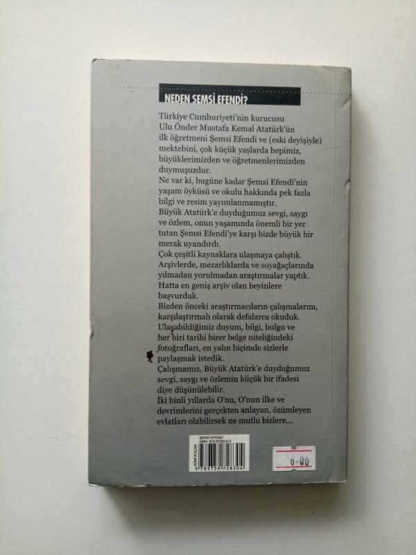 Türkiye Cumhuriyeti'nin kurucusu Ulu Önder Mustafa Kemal Atatürk'ün ilk öğretmeni Şemsi Efendi ve (eski deyişle) mektebini, çok küçük yaşlarda hepimiz, büyüklerimizden ve öğretmenlerimizden duymuşuzdur. Ne var ki, bugüne kadar Şemsi Efendi'nin yaşam öyküsü ve okulu hakkında pek fazla bilgi ve resim yayımlanmamıştır. Büyük Atatürk'e duyduğumuz sevgi, saygı ve özlem, onun yaşamında önemli bir yer tutan Şemsi Efendi'ye karşı bizde büyük bir merak uyandırdı. Çok çeşitli kaynaklara ulaşmaya çalıştık. Arşivlerde, mezarlıklarda ve soyağaçlarında yılmadan yorulmadan araştırmalar yaptık. Hatta en geniş arşiv olan beyinlere başvurduk. Bizden önceki araştırmacıların çalışmalarını, karşılaştırmalı olarak defalarca okuduk. Ulaşabildiğimiz duyum, bilgi, bulgu ve her biri tarihi birer belge niteliğindeki fotoğrafları, en yalın biçimde sizlerle paylaşmak istedik. Çalışmamız, Büyük Atatürk'e duyduğumuz sevgi, saygı ve özlemin küçük bir ifadesi diye düşünülebilir. İki binli yıllarda O'nu, O'nun ilke ve devrimlerini gerçekten anlayan, özümleyen evlatları olabilirsek ne mutlu bizlere...