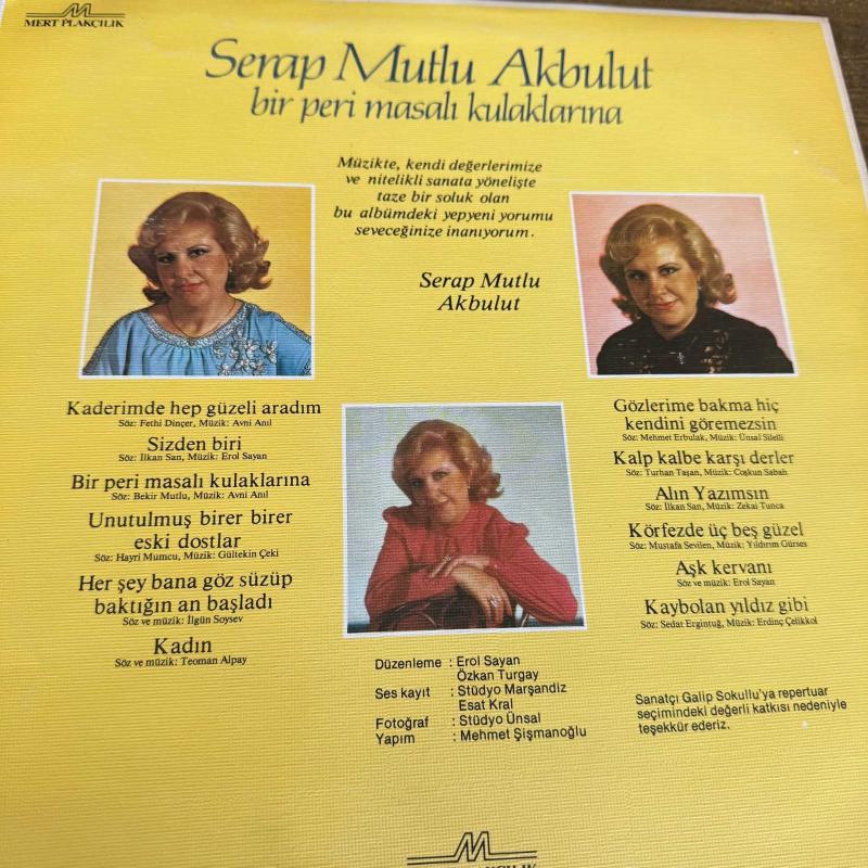 SERAP MUTLU AKBULUT. BİR PERİ MASALI KULAKLARINA. LONGPLAY başlıklı ürün, Efemera, Müzik, Sinema > Müzik, Plak, Kaset, CD > Plak > Yerli Plaklar > Yerli 33 Devir Plak (33'lük, LP) kategorisi altında İkinci El olarak satılmaktadır.