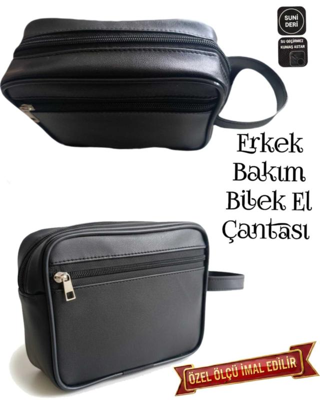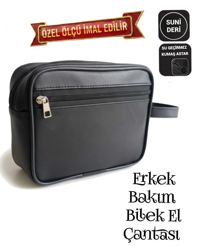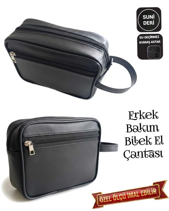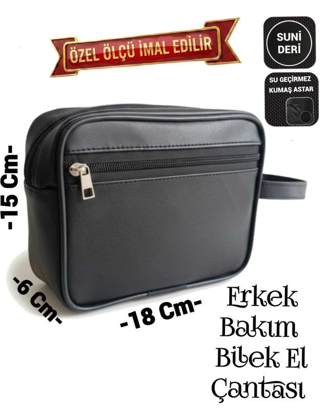 Sevbags Erkek Bakım Bilek El Çantası .Suni Deriden İmal Edilmiştir .İç Kısım Su Geçirmez Kumaş İle Astarlanmıltır .Kenarları Sert Plastik Fitil Çekilmiştir .2 Bölmeli .Yükselik 15cm, Genişlik 18cm, Yan Körük 6cm Ölçülerinde İmal Edilmiştir Özel Ölçü İmalat Yapılır