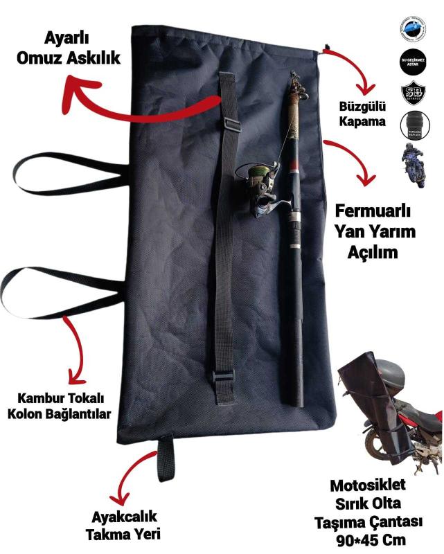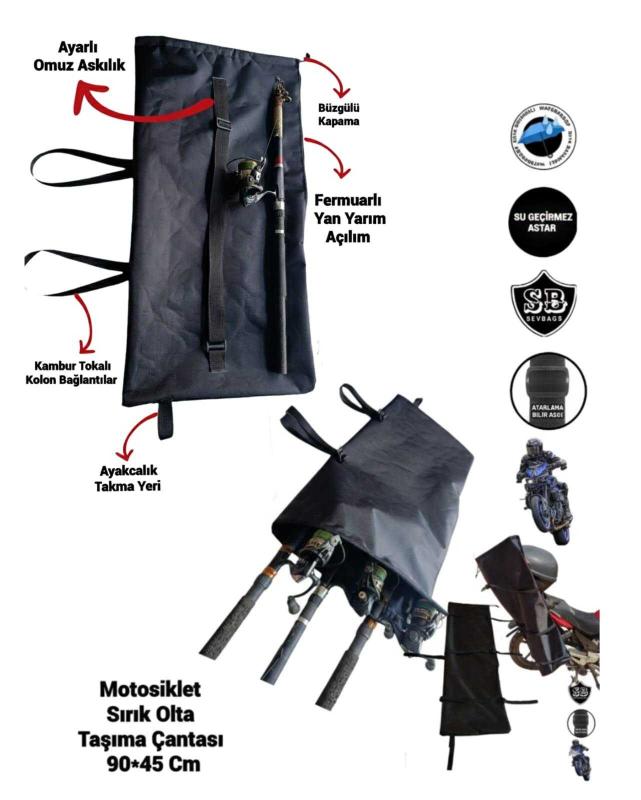 Sevbags Motosiklet Sırık Olta Taşıma Çantası Motosikletinizin arka kısmına kolayca takılabilen ve pratik kullanım sunan arka çanta tasarımı Dayanıklı malzemeden üretilmiş olup, uzun süreli kullanım için idealdir Geniş iç hacmi sayesinde oltalarınız ve diğer ekipmanlarınız için yeterli alan sağlar Kolay erişim için tasarlanmış Ayarlı Omuz Askılığı, Büzgülü Kapama, Fermuarlı Ağız Genişletme eşyalarınızı düzenli bir şekilde saklamanızı kolaylaştırır Su itici kumaş özelliği ile yağmur ve nemli hava koşullarında bile içerisindeki eşyalarınızın korunmasını sağlar 2 Aget kambur tokalı bağlantı aparatı,Ayakcalık takma kolonu büzgülü kapama, fermuarlı ağız genişletme,Ayarlı taşına bilir omuz askılığı 90*45 Cm ölçülerinde imal edilmiştir Özel ölçü imalat yapılmaktadır