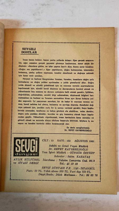 SEVGİ DÜNYASI DERGİSİ - AĞUSTOS 1981 SAYI: 152 DR. REFET KAYSERİLİOĞLU - GÜNGÖR ÖZYİĞİT - SALİM KABATAŞ - ACAR DOĞANGÜN ÖZDE BİRDİR İNSAN - İÇSEL SAVAŞ VE DOĞRU YOLA DÖNÜŞ - YÜKSELME VE BEŞ ESAS - DÜNYAYA TEKRAR GELMEK - GEÇMİŞ HAYATLARI HATIRLAMA OLAYLARI - EKMİNEZİ İLE RUH DENEYİMLERİ - BİLİMSEL ÖRNEKLERLE REENKARNASYON - BUGÜNÜN DİLİYLE HADİSLER - VAHİY VE PEYGAMBERLİK - SPİRİTUALİZM VE YAŞAM YOLU - TANRI’NIN İŞLEYİŞİ VE RUHSAL HİYERARŞİ - RUHSAL YASALAR: İYİLİK, GERÇEK, GÜZELLİK, HAK, SEVGİ - RUHLAR ARASI KÖPRÜ OLARAK SEVGİ - BELGELERLE İKİ VE DAHA ÇOK YAŞAM KİTABI - DÜNYA BİRLİĞİ VE ÖLÜM KORKUSUNUN AZALMASI - İNANMAK VE İNKÂR ARASINDA BİREYİN SEÇİMİ - TAM TAKIM EKSİKSİZ 42 SAYFA adlı eser, Kitap > Süreli Yayınlar > Dergiler > Magazin, Moda kategorisinde İkinci El olarak satıştadır.