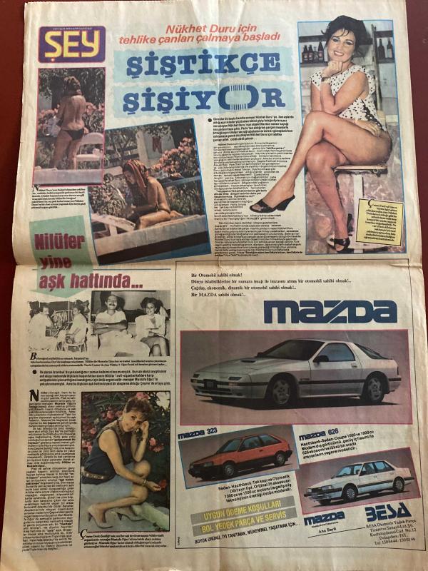 ŞEY GAZETESİ DOĞUM GÜNÜ HEDİYESİ - 12 TEMMUZ 1986 - SAYI: 43 - 4 SAYFADIR -Nazan Şoray-Ahmet Özhan-Handan Müftüoğlu-Filiz Akın-Harika Avcı-Ferdi Tayfur-Necla Nazır-Burçin Orhon-Sezen Aksu-İbrahim Tatlıses-Ayşe Seymen-Serpil Çakmaklı-Nükhet Duru-Nilüfer-Mehtap Demir-Derya Arbaş-Arif Kaptan-Hülya Süer-Kadir İnanır-Derya Tuna-Gönül Öner Nazan Şoray 5 aylık hamile-Ahmet Özhan bu günahı temizlemeli-Kaçışındaki esrar perdesi kalktı-Evlilik masalını başlatan buluşma-Bu da Özhan’ın kopamadığı Filiz-Yasak aşkın bedeli 200 milyonluk daire-Şarkıcılık sırası kayınçoda-Ferdi Tayfur Necla Nazır aşkı yeni bir şöhret doğuruyor-Bu kazığın acısını çıkaracağım-Sahnede fiyat rekorları-1.5 milyonluk Sezen-14 milyonluk İbo Show-TRT’nin örtemediği şarkıcı-Çeşme’de bıngıl bıngıl bir yıldız-En büyük şanssızlığı Türk şarkıcı olması-Böyle bir yarışma tek başına sunulmaz-Festivalin bedavacıları-Nükhet Duru için tehlike çanları çalmaya başladı-Şiştikçe şişiyor-Milüfer yine aşk hattında adlı eser Türkçe dilindedir.