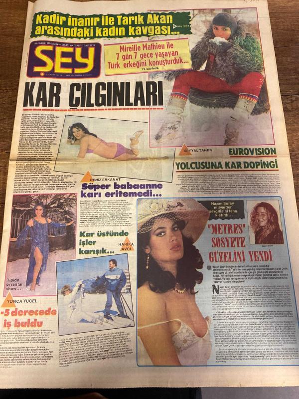 ŞEY HAFTALIK MAGAZİN GAZETESİ DOĞUM GÜNÜ HEDİYESİ ( Turkish Newspaper ) - 21 MART 1987 -TAM TAKIM 12 SAYFADIR -Kadir İnanır-Tarık Akan-Mireille Mathieu-Seyyal Taner-Deniz Erkanat-Harika Avcı-Yonca Yücel-Nazan Şoray-Sadet Bostan-Erol Atar-Muazzez Abacı-Mesut Yılmaz-Ajda Pekkan-Emrah-Perran Kutman-Şevkat Alparslan-Serpil Çakmaklı-Ahu Tuğba-Tarık Alpözlü-Ünal Nargın-Ferahnaz-Azra Balım-Ferhunde Karaca-Bedia Akartürk-Arif Susam-Ferdi Tayfur-Reyhan Can-Sakıp Sabancı-Recep Aytekin-Ersan Tuyan-Müjde Ar-Emel Erdal-Gülistan Guzey-Bundan Yıldız Pırlanta Üretim-Ayşe Cesoy-Yadigar Ergezer-Kadir İnanır-Tarık Akan-Nebahat Atar-Müjde Ar-Hülya Avşar-Melike Zobu-Ayşe Kucuroğlu-Zeki Müren-Kar Çılgınları-Eurovision Yolcusuna Kar Dopingi-Süper Babaanne Karı Eritemedi-Kar Üstünde İşler Karışık-5 Derecede İş Buldu-“Metres” Sosyete Güzelini Yendi-Bir Türkçe Kelime Öğrenmeyi İstemezdi-Bizim Sanatçılar Gibi Parayı Çok Seviyor Aynı Zamanda Süper Cimri-Aşırı Milliyetçi ve Dindar-Ooo Bu Ne Büyük Jest-Kadınların, HÜSEYİN CAN tarafından kaleme alınmıştır. ŞEY HAFTALIK MAGAZİN GAZETESİ DOĞUM GÜNÜ HEDİYESİ ( Turkish Newspaper ) - 21 MART 1987 -TAM TAKIM 12 SAYFADIR -Kadir İnanır-Tarık Akan-Mireille Mathieu-Seyyal Taner-Deniz Erkanat-Harika Avcı-Yonca Yücel-Nazan Şoray-Sadet Bostan-Erol Atar-Muazzez Abacı-Mesut Yılmaz-Ajda Pekkan-Emrah-Perran Kutman-Şevkat Alparslan-Serpil Çakmaklı-Ahu Tuğba-Tarık Alpözlü-Ünal Nargın-Ferahnaz-Azra Balım-Ferhunde Karaca-Bedia Akartürk-Arif Susam-Ferdi Tayfur-Reyhan Can-Sakıp Sabancı-Recep Aytekin-Ersan Tuyan-Müjde Ar-Emel Erdal-Gülistan Guzey-Bundan Yıldız Pırlanta Üretim-Ayşe Cesoy-Yadigar Ergezer-Kadir İnanır-Tarık Akan-Nebahat Atar-Müjde Ar-Hülya Avşar-Melike Zobu-Ayşe Kucuroğlu-Zeki Müren-Kar Çılgınları-Eurovision Yolcusuna Kar Dopingi-Süper Babaanne Karı Eritemedi-Kar Üstünde İşler Karışık-5 Derecede İş Buldu-“Metres” Sosyete Güzelini Yendi-Bir Türkçe Kelime Öğrenmeyi İstemezdi-Bizim Sanatçılar Gibi Parayı Çok Seviyor Aynı Zamanda Süper Cimri-Aşırı Milliyetçi ve Dindar-Ooo Bu Ne Büyük Jest-Kadınların adlı eser Türkçe dilindedir.