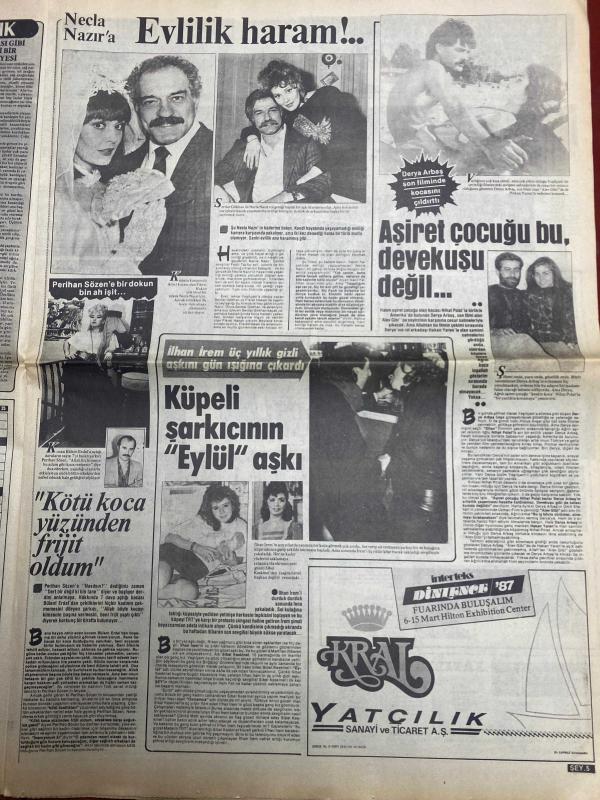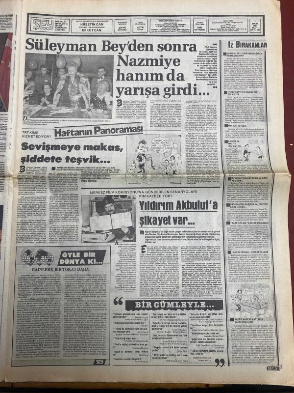 ŞEY HAFTALIK MAGAZİN GAZETESİ DOĞUM GÜNÜ HEDİYESİ ( Turkish Newspaper ) - 7 MART 1987 -TAM TAKIM 12 SAYFADIR -Müjde Ar-Mesut Yılmaz-Alife Jale-Ahu Tuğba-Banu Alkan-Müşerref Akay-Nazlı Sevim-Sevgi Öztürk-Tarık Akan-Şehnaz Dilan-Yunus Bülbül-Kemal Sunal-Şener Şen-Ahmet Özhan-Aydan Şener-Sibel Can-Aysel Mutlu-Ünal Narcin-Ferahnaz-Arzu Arıkan-Semra Özal-Süleyman Demirel-Nazmiye Demirel-Yıldırım Akbulut-Tekin Akmansoy-Cihat Güner-Ceylan-Leyla Önder-Bülent Kayabaş-Atilla Yelken-Alev Sayın-Meral Zeren-Nadia Shouli-Necla Nazır-Ferdi Tayfur-Derya Arbaş-Müjdat Gezen-Perihan Savaş-İlhan İrem-Eylül Mihri Peker-Derya Arbaş-Derya Arbaş-Melih Peker-Emrah-Müjde Ar’dan Mesut Yılmaz’a 56 milyonluk öfke-Aykırı kadın-Alife Jale’yi devlete satarım-Çıplaklar hamama-Banu Alkan’ı çıldırtan gelin-35 dolarla gitti milyoner döndü-Bu kızı deliler gibi seviyorum-Tarık Akan’ın gözyaşartan jesti-Ben hayat kadını değilim-Almanya’da en büyük benim-Canan hanımın kulakları çınlasın-Sibel Can’a nazar değdi-Bir nevi kuma, HÜSEYİN CAN tarafından kaleme alınmıştır. ŞEY HAFTALIK MAGAZİN GAZETESİ DOĞUM GÜNÜ HEDİYESİ ( Turkish Newspaper ) - 7 MART 1987 -TAM TAKIM 12 SAYFADIR -Müjde Ar-Mesut Yılmaz-Alife Jale-Ahu Tuğba-Banu Alkan-Müşerref Akay-Nazlı Sevim-Sevgi Öztürk-Tarık Akan-Şehnaz Dilan-Yunus Bülbül-Kemal Sunal-Şener Şen-Ahmet Özhan-Aydan Şener-Sibel Can-Aysel Mutlu-Ünal Narcin-Ferahnaz-Arzu Arıkan-Semra Özal-Süleyman Demirel-Nazmiye Demirel-Yıldırım Akbulut-Tekin Akmansoy-Cihat Güner-Ceylan-Leyla Önder-Bülent Kayabaş-Atilla Yelken-Alev Sayın-Meral Zeren-Nadia Shouli-Necla Nazır-Ferdi Tayfur-Derya Arbaş-Müjdat Gezen-Perihan Savaş-İlhan İrem-Eylül Mihri Peker-Derya Arbaş-Derya Arbaş-Melih Peker-Emrah-Müjde Ar’dan Mesut Yılmaz’a 56 milyonluk öfke-Aykırı kadın-Alife Jale’yi devlete satarım-Çıplaklar hamama-Banu Alkan’ı çıldırtan gelin-35 dolarla gitti milyoner döndü-Bu kızı deliler gibi seviyorum-Tarık Akan’ın gözyaşartan jesti-Ben hayat kadını değilim-Almanya’da en büyük benim-Canan hanımın kulakları çınlasın-Sibel Can’a nazar değdi-Bir nevi kuma adlı eser Türkçe dilindedir.