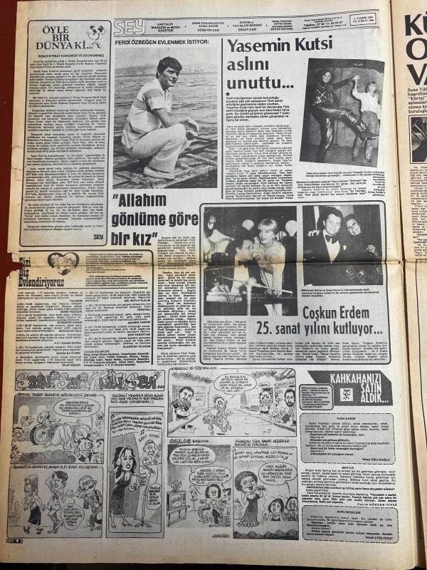 ŞEY HAFTALIK MAGAZİN GAZETESİ DOĞUM GÜNÜ HEDİYESİ ( Turkish Newspaper ) - 9 KASIM 1981 - TAM TAKIM 12 SAYFADIR -Kadir İnanır-Canan Yaka-Hatice İnanır-Mualla Özbek-Banu Alkan-Gülden Tuncer-Ümit Besen-Gönül Yazar-Nazan Şoray-Hüseyin Peyda-Biricik-Nigar Uluerer-Adnan Pekak-Akın Uğurlu-Nazan Berk-İsmail Badilli-Sevim Emre-Tanju Okan-Sermin Can-Selma Güneri-Ferdi Özbeğen-Yasemin Kutsi-Coşkun Erdem-Barış Manço-Serpil Çakmaklı-Musa Gönenç-Gülden Karaböcek-Gülden Çelik-Hüner Coşkuner-Nuri Sesigüzel-Zati Sungur-Ruza Özlügüner Kadir İnanır Canan Yaka evliliği suya mı düştü-Nikahı iki kadın engelliyor-Oğlumun kararına güveniyorum-Ne anadan ne yardan-Kadir’i çok seviyorum amma-Söyleyin benden güzeli var mı-Banu Alkan pamuk prensesin üvey annesini de geçti-Hizmette sınır yoktur-Yaşam sigortalılar büyüyor-Yasemin Kutsi aslını unuttu-Allahım gönlüme göre bir kız-Coşkun Erdem 25. sanat yılını kutluyor-Barış Manço kendini hıyar gibi hissediyor-Serpil Çakmaklı nişanı attı-Allah dedi Allah yüzüne baktı-, ORHAN OLCAY tarafından kaleme alınmıştır. ŞEY HAFTALIK MAGAZİN GAZETESİ DOĞUM GÜNÜ HEDİYESİ ( Turkish Newspaper ) - 9 KASIM 1981 - TAM TAKIM 12 SAYFADIR -Kadir İnanır-Canan Yaka-Hatice İnanır-Mualla Özbek-Banu Alkan-Gülden Tuncer-Ümit Besen-Gönül Yazar-Nazan Şoray-Hüseyin Peyda-Biricik-Nigar Uluerer-Adnan Pekak-Akın Uğurlu-Nazan Berk-İsmail Badilli-Sevim Emre-Tanju Okan-Sermin Can-Selma Güneri-Ferdi Özbeğen-Yasemin Kutsi-Coşkun Erdem-Barış Manço-Serpil Çakmaklı-Musa Gönenç-Gülden Karaböcek-Gülden Çelik-Hüner Coşkuner-Nuri Sesigüzel-Zati Sungur-Ruza Özlügüner Kadir İnanır Canan Yaka evliliği suya mı düştü-Nikahı iki kadın engelliyor-Oğlumun kararına güveniyorum-Ne anadan ne yardan-Kadir’i çok seviyorum amma-Söyleyin benden güzeli var mı-Banu Alkan pamuk prensesin üvey annesini de geçti-Hizmette sınır yoktur-Yaşam sigortalılar büyüyor-Yasemin Kutsi aslını unuttu-Allahım gönlüme göre bir kız-Coşkun Erdem 25. sanat yılını kutluyor-Barış Manço kendini hıyar gibi hissediyor-Serpil Çakmaklı nişanı attı-Allah dedi Allah yüzüne baktı- adlı eser Türkçe dilindedir.