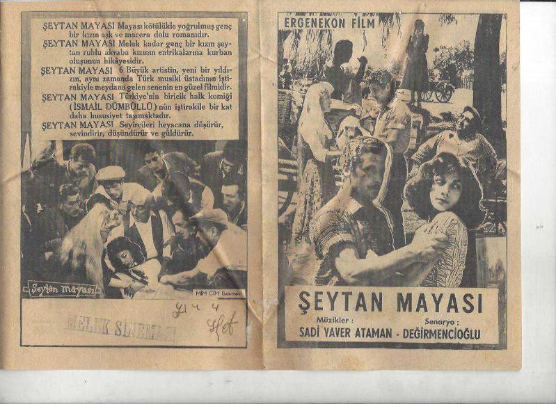 ŞEYTAN MAYASI - OYUNCULAR: ÇOLPAN İLHAN, KENAN PARS, SADRİ ALIŞIK, EVRİM FER, ŞÜKRİYE ATAV VE İSMAİL DÜMBÜLLÜ (MELEK SİNEMASI GÖSTERİMİ İÇİN REKLAM BROŞÜRÜ)