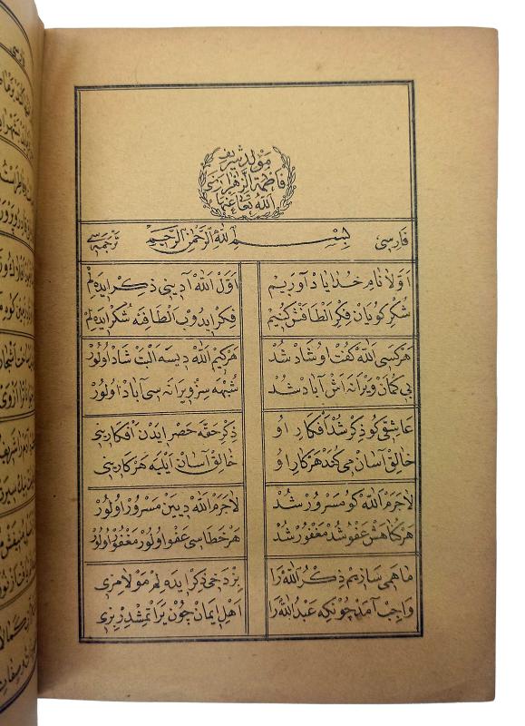 HACI MUHAMMED ES'AD., N.p., İstanbul, [Hicrî: 1327] = Milâdî: 1911. Özgün kağıt kapaklarında, çok temiz durumda, 21 x 14 cm, Osmanlıca, 13 sayfa. Taşbaskı. Hazreti Fatma'nın hayatını anlatan bu mevlîd formunda eserin ilk Osmanlıca çevirisi ve ilk baskısı. 13 sayfaya yayılmış toplamda 74 beyitten oluşan eser, "fâilâtün fâilâtün fâilün" vezniyle yazılmıştır. Hazreti Fatıma, İslam peygamberi Muhammed'in kızı, Ali bin Ebu Talib'in eşidir. Muhammed’in ilk eşi Hatice bint Hüveylid’den olan kızıdır. Muhammed’in soyu, Fatıma ve eşi Ali bin Ebu Talib’in çocukları yoluyla devam etmiştir, çünkü Muhammed’in ölümünden sonra hayatta kalan tek çocuğu Fatıma’dır. Sünni inanışına göre 605 veya 609, Şîʿa'ya göre 614 yılında Mekke'de dünyaya gelmiştir. 632 yılında, Medine'de babasının ölümünden 6 ay sonra ölmüştür. Doğum tarihiyle ilgili çeşitli rivayetler olsa da bunlardan en güçlüleri 614 (Şii görüşü) ve 605 veya 609 (Sünni görüşü) yıllarıdır ve iki rivayette doğumun Mekke civarlarında olduğu görüşündedir. Fatıma, Muhammed 45 yaşında iken dünyaya geldi. Doğum tarihiyle ilgili çeşitli rivayetler olsa da bunlardan en güçlüleri 614 (Şii görüşü) ve 605 veya 609 (Sünni görüşü) yıllarıdır ve iki rivayette doğumun Mekke civarlarında olduğu görüşündedir. Fatıma, Muhammed 45 yaşında iken dünyaya geldi. Doğumundan önce, Muhammed'in muhalifleri, onun son oğlunun da öldüğünü görünce, Muhammed'in soyunu sürdürecek kimsenin kalmayacağı, yolunun da bu yüzden mahvolacağı yönünde propaganda başlatmışlardı. Bu propagandaya Kevser Suresi ile cevap verilmiştir: "Şüphesiz biz sana bol hayır (bereketli nesil) vermişiz. Öyleyse Rabbin için namaz kıl ve kurban kes. Doğrusu asıl ebter (soyu kesik) olan sana kin duyandır." Küçük yaşından itibaren babasının her işine koşturması, onu bir anne gibi koruyup kollaması sebebiyle babası Muhammed ona; “Ümmü Ebîha” yani "Babasının Annesi" lakabını vermiştir. 624'te, aynı zamanda Muhammed’in kuzeni olan Ali bin Ebu Talib ile evlendi. 632'de Şii kaynaklarına göre Ömer ile aralarında geçen tartışma sonucu ölmüştür. OCLC'de yok.; Özege 13387. -- Kadın İslam Şia Mevlid Türk edebiyatı Fars edebiyatı