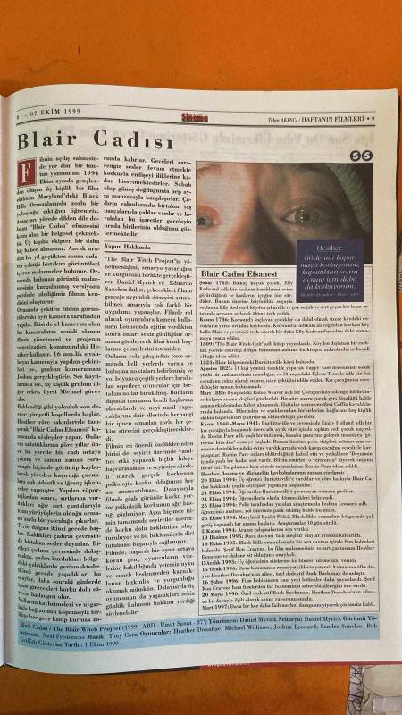 SİNEMA HAFTALIK ANTRAKT GAZETESİ - 01-07 EKİM 1999 - HEATHER DONAHUE - MICHAEL WILLIAMS - JOSHUA LEONARD - DANIEL MYRICK - EDUARDO SANCHEZ - BEN ROCK - RICARDO R. MORENO - NEAL FREDERICKS - ANTONIO CORA - BOB EICK - KEVIN J. FOXE - MICHAEL MONELLO - GREGG HALE - ROBIN COWIE - NATALIE PORTMAN - SUSAN SARANDON - IRFAN ATASOY - FERZAN ÖZİPEK - ZEYNEP AKSU - TOLGA AKİNES - SADİ ÇİLİNGİR - ÜNSAL OSKAY - ŞÜKRAN ESEN - HİLMİ ETİKAN - HÜSEYİN KUZU - SEVİN OKYAY - MEHMET AÇAR - CAN ANAMUR - UMUT ARAL - İNANÇ AYAR - ÖZGÜR EKEN - AHMET ULUÇAY - AYLA KANBUR - E. ÖZGÜVEN - BELMİN SÖYLEMEZ - ANTONIO BANDERAS - CARLOS SAURA - RUBEN DARIO - ROBERT DE NIRO - BILLY CRYSTAL - LISA KUDROW - HAROLD RAMIS - KENNETH LONERGAN - PETER TOLAN - PAULA WEINSTEIN - JANE ROSENTHAL BAŞLIKLAR: BLAIR CADISI - ROMANCE - HAREM SUARE - NATALIE PORTMAN DOSYASI - CINE5 II. ULUSAL KISA FİLM YARIŞMASI - BANDERAS'TAN YENİ FİLM - ANALYZE THIS FİLMLER: THE BLAIR WITCH PROJECT - ROMANCE - HAREM SUARE - STAR WARS: EPI - 14 SAYFA adlı eser Türkçe dilindedir.