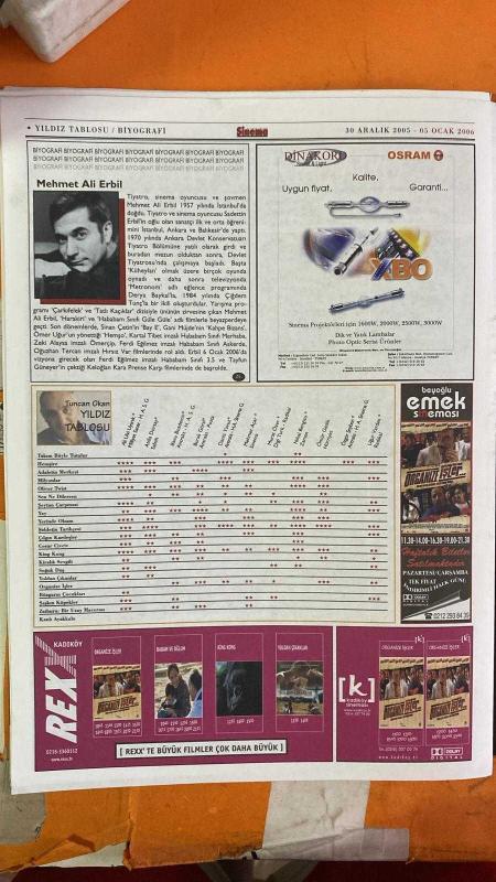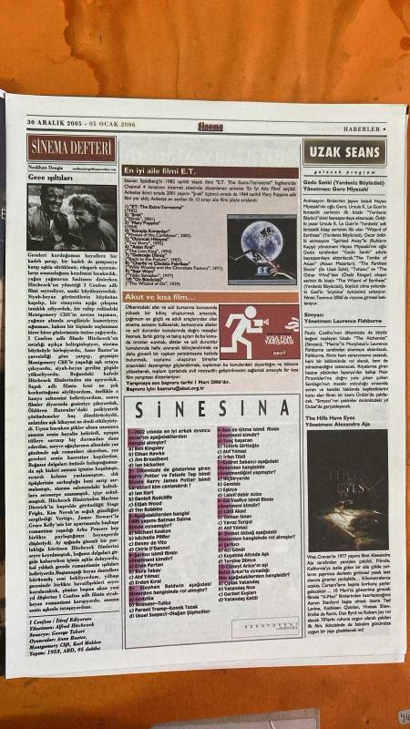 SİNEMA HAFTALIK ANTRAKT GAZETESİ - 30 ARALIK 2005 – 05 OCAK 2006 HABABAM SINIFI ÜÇBUÇUK FİLMİ : MEHMET ALİ ERBİL – SEDA SAYAN – ŞAFAK SEZER – MEHMET ALİ ALABORA – PEKER AÇIKALIN – CENGİZ KÜÇÜKAYVAZ – MELİH EKENER – KIBARIYE – HAKAN YILMAZ – DOST ELVER – SÜMER TİLMANÇ – ZİHNİ GÖKTAY – HAMİT HASKABAL – TUNCAY AKÇA – DENİZ ORAL – BURAK ÖNCÜ – DURAN URUÇ – HASANCAN SEREMET – SEÇKİN PIRİLER – TUĞÇE KOÇAK – ZEYNEP KARACAN – HALİT AKÇATEPE TAKVA FİLMİ : ERKAN CAN – MERAY ÜLGEN – GÜVEN KIRAÇ – ERMAN SABAN CENNETİ BEKLERKEN FİLMİ : SERHAT TUTUMLUER – AHMET MÜMTAZ TAYLAN – MELİSA SÖZEN – MEHMET ALİ NUROĞLU – NİHAT İLERİ KARDEŞLER FİLMİ : DENİZ BUGA (kısa film) ZİLZALA FİLMİ : MEHMET BAHADIR ER (kısa film) BİR ÇİFT KANADIN PEŞİNDE FİLMİ : BEHİYE YILMAZ (belgesel kısa film) KESİŞME FİLMİ : DEVRİM ERDOĞAN (kısa film) BANK FİLMİ : TUNAY SEVİÇ (kısa film) TAKSİ ŞOFÖRÜ XL FİLMİ : KAAN ŞENSOY (belgesel kısa film) BAŞLIKLAR: HABABAM SINIFI ÜÇBUÇUK VİZYONDA · CHARLOTTE RAMPLING BERLİN JÜRİ BAŞ- 18 SAYFA adlı eser, Kitap > Süreli Yayınlar > Dergiler > Sanat > Sinema, Radyo, TV kategorisinde İkinci El olarak satıştadır.