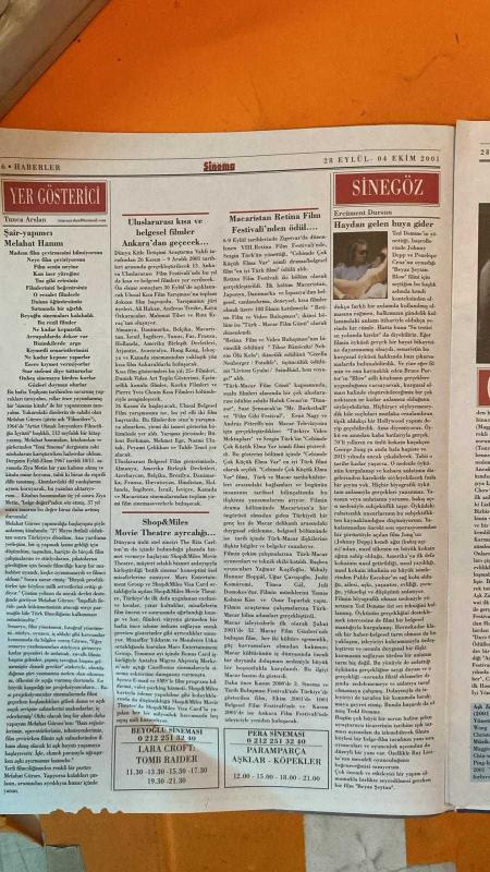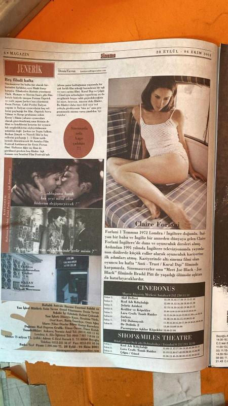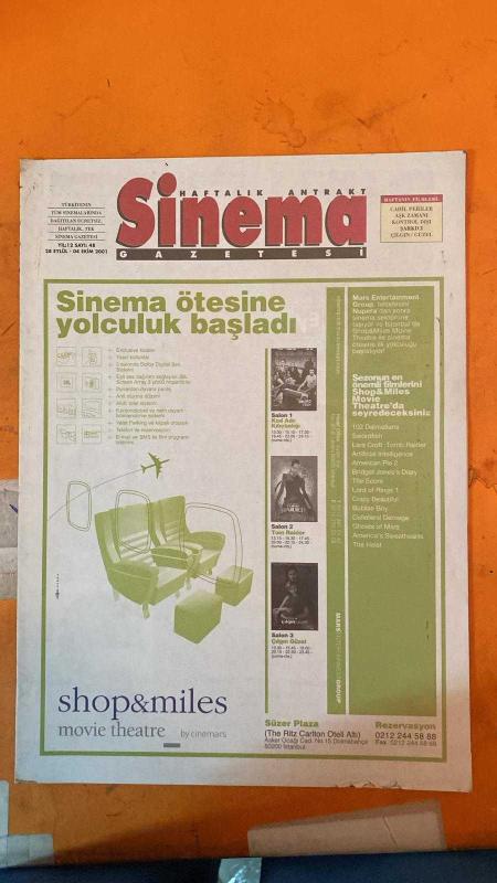 SİNEMA HAFTALIK ANTRAKT gazetesi- 4 EKİM 2001 - KIM BASINGER – LIAM AIKEN – MARGHERITA BUY – STEFANO ACCORSI – SERRA YILMAZ – KORAY CANDEMIR – MAGGIE CHEUNG – TONY LEUNG – CLAIRE FORLANI – YEŞİM SALKIM – BERHAN ŞİMŞEK – NURSELİ İDİZ – WONG KAR-WAI – FERRAN ÖZPETEK – ERSİN PERTAN - I DREAMED OF AFRICA – IN THE MOOD FOR LOVE / AŞK ZAMANI – LE FATE IGNORANTI / CAHİL PERİLER – ANTI-TRUST / KURAL DIŞI – ÇILGIN / GÜZEL – ŞARKICI – MEET JOE BLACK – SWORDFISH – LARA CROFT: TOMB RAIDER – ARTIFICIAL INTELLIGENCE – AMERICAN PIE 2 – BRIDGET JONES’S DIARY – THE SCORE – LORD OF THE RINGS: THE FELLOWSHIP OF THE RING – BUBBLE BOY – COLLATERAL DAMAGE – GHOSTS OF MARS – AMERICA’S SWEETHEARTS – AKIL DEFTERİ – ŞEHRİN AZİZLERİ – KEDİLER VE KÖPEKLER – DR DOLITTLE 2 – PARAMPARÇA AŞKLAR KÖPEKLER - 14 SAYFA adlı eser Türkçe dilindedir.