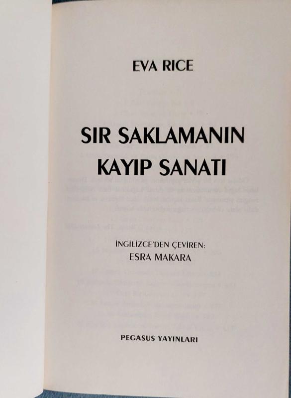 SIR SAKLAMANIN KAYIP SANATI, EVA RICE tarafından kaleme alınmıştır. Kitap 2006 yılında PEGASUS YAYINLARI tarafından [İSTANBUL] yayınlanmıştır. Satışta olan kitap, yayınevinin 1. baskısıdır. Bu baskının çevirisi ESRA MAKARA tarafından yapılmıştır. 448 sayfadır. SIR SAKLAMANIN KAYIP SANATI adlı eser Türkçe dilindedir.