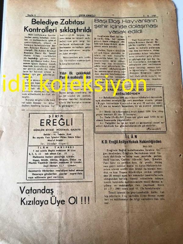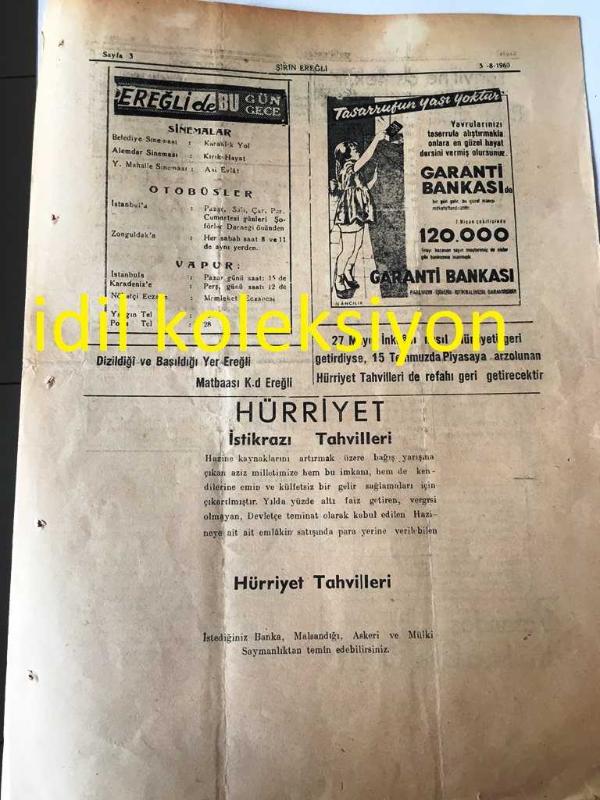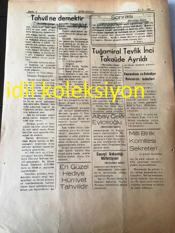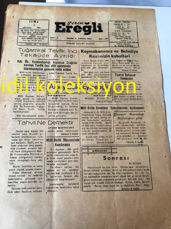 ŞİRİN EREĞLİ GAZETESİ YEREL TAŞRA BASINI ---5 Ağustos 1960 Yıl :4 Sayı :640--Tuğamiral Tevfik İnci Tekaüde Ayrıldı --Albay Celal Eyiceoğlu Üs Kumandanlığı vekiline getirildi--Tahvil ne demek tir :Ayten Hatice Eti --Milli Birlik Komitesi --Ereğli de gece --Sinemalar : Belediye Sineması : Kararlık Yol,,Alemdar Sineması :Kırık Hayat , Mahalle Sineması : Asi Evlat -- Yıpranma, sararmalar, kupon kesiği ve yırtılmalar zamana bağlı olarak görülebilir.