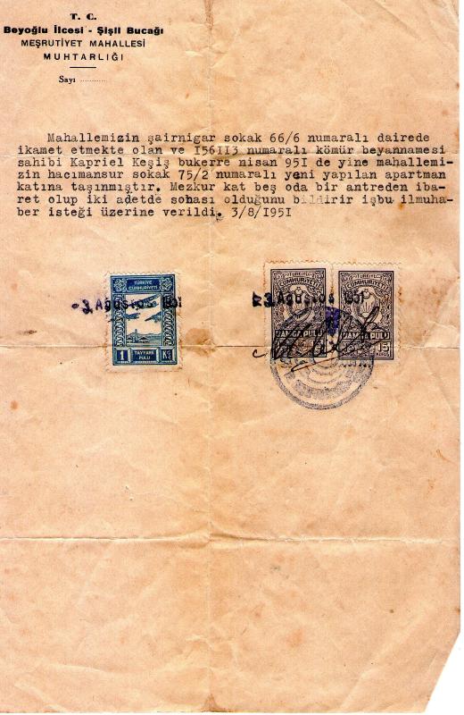 ŞİŞLİ NİŞANTAŞI MEŞRUTİYET MAHALLESİ MUHTARLIĞI " KAPRİEL KEŞİŞ" 1951, 2 yıl önce satışa sunulmuştur.