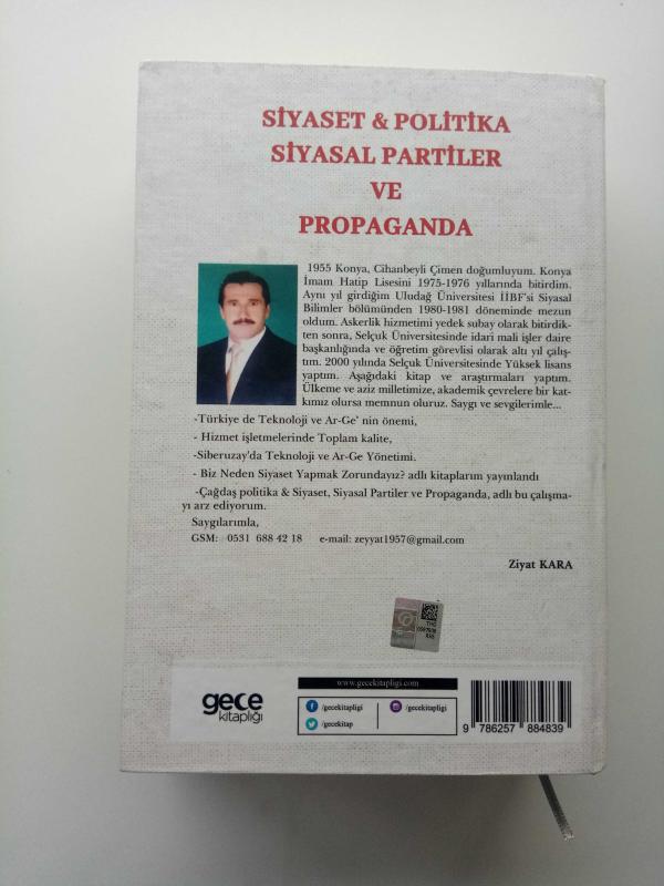 1955 Konya, Cihanbeyli Çimen doğumluyum. Konya İmam Hatip Lisesini 1975-1976 yıllarında bitirdim. Aynı yıl girdiğim Uludağ Üniversitesi İİBF’si Siyasal Bilimler bölümünden 1980-1981 döneminde mezun oldum. Askerlik hizmetimi yedek subay olarak bitirdikten sonra, Selçuk Üniversitesinde idari mali işler daire başkanlığında ve öğretim görevlisi olarak altı yıl çalıştım. 2000 yılında Selçuk Üniversitesinde Yüksek lisans yaptım. Aşağıdaki kitap ve araştırmaları yaptım. Ülkeme ve aziz milletimize, akademik çevrelere bir katkımız olursa memnun oluruz. Saygı ve sevgilerimle... -Türkiye de Teknoloji ve Ar-Ge’ nin önemi, - Hizmet işletmelerinde Toplam kalite, -Siberuzay'da Teknoloji ve Ar-Ge Yönetimi. - Biz Neden Siyaset Yapmak Zorundayız? adlı kitaplarım yayınlandı -Çağdaş politika & Siyaset, Siyasal Partiler ve Propaganda, adlı bu çalışmayı arz ediyorum. Saygılarımla,