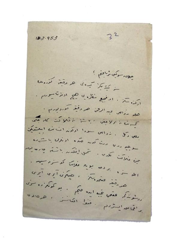 Orijinal Osmanlıca el yazması mektup, bifolium, arkalı önlü 2 sayfa, "Mükerrem" imzalı. 10.03.1953 tarihli. Eşi Süreyya Bey'e yazmış olduğu mektupta, çocuklarının kötü bir hastalığa yakalandığı anlaşılıyor. Sevda ve Abdurrahman adında başka hasta çocuklardan bahsediliyor. Mektubun yazarı bir süreliğine ayrı kalmak zorunda oldukları eşini teselli etmeye çalışıyor.