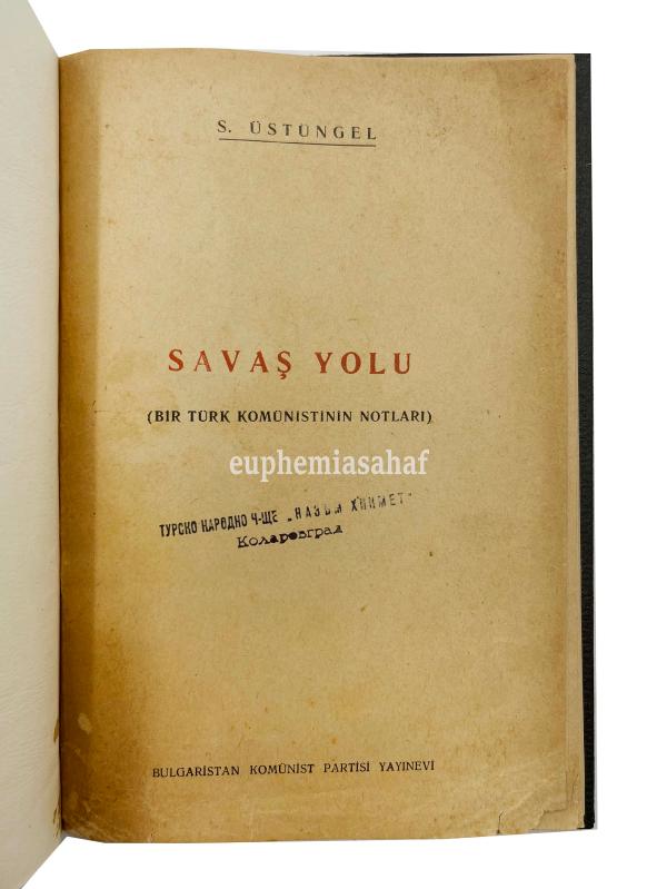 Sonradan yapılmış bez cildinde, temiz durumda, 20 x 14 cm, 108, [1] sayfa "Savaş yolu. Bir Türk komünistinin notları.", S. Üstüngel, Bulgaristan Komünist Partisi Yayınevi, Sofya, 1952. 1500 adet basılmış ve sadece Türk üyelere dağıtılmıştır Sofya'da Bulgaristan Komünist Partisi'ne üye Türklerce basılan eser çok çok nadirdir -- Balkan Türkleri Sol Türk solu Bulgaristan Faşizm Türk edebiyatı Koleksiyon Anı Hatırat TKP Türk Komünizmi