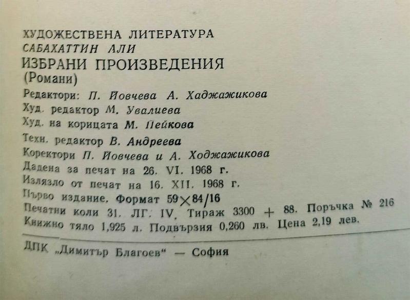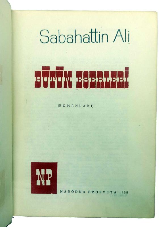 Yayıncısının özgün cildinde, çok temiz durumda, 20 x 14 cm, 493, [3] sayfa. "[SOFYA BASKISI] Romanlar 1. Bütün Eserleri.", SABAHATTİN ALİ, (1907-1948), Narodna Prosveta, Sofya, 1968. İlk Sofya baskısı. Çok çok nadir. Bu kitap yazarın Kuyucaklı Yusuf ve İçimizdeki Şeytan adlı romanlarıyla birlikte İbrahim Tatarlı'nın "Sabahattin Ali'nin romancılığı" adlı uzun giriş yazısını içermektedir (s. 5-66). 3300 adet basılmıştır. -- Türk edebiyatı Bulgaristan Türkleri Trakya Balkanlar Türk solu Komünizm Bulgar faşizmi.