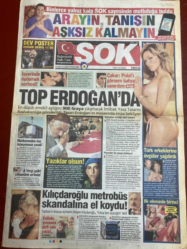 ŞOK GAZETESİ DOĞUM GÜNÜ HEDİYESİ - 14 MAYIS 2009 - TAM TAKIM 12 SAYFADIR - KATE’DEN SEVGİLERLE HUMMER POSTERİ TAM SAYFA - Recep Tayyip Erdoğan-Kemal Kılıçdaroğlu-Ahmet Çakar-Necati Şaşmaz-Bergüzar Korel-Oktay Kaynarca-Noella Nance-Dr. Figen Ökten-Hakan Tankut-Anna Babkova-Tuğba Özay-Barack Obama-Yılmaz Erdoğan-Hadise-Aykut Gürel-Seden Gürel-Seren Serengil-Hakan Eratik-Yeşim Salkım-Kenan Doğulu-Burcu-Kenan İmirzalioğlu-Meryem Uzerli Top Erdoğan’da-İşyerinde öpüşmek serbest-Çakar: Polat’ı görsem kahya sanırdım-Yazıklar olsun-Kılıçdaroğlu metrobüs skandalına el koydu-Türk erkeklerine övgüler yağdırdı-İlk elemde birinci-Kewell Owen için devrede-Noella’nın ilginç tutkusu-Ve masal bitti-Ekranlarda Asenaca konuşacak-Sevgilisiyle el ele yakalandı-Gizli aşk yuva yıktı-Tecavüz etti dilim damağım kurudu-Çöpçatan programında evlenince ortalık karıştı-Çok çirkindim ve çok korktum-Doğamda var deyip aldatan eşini affetti-Seren para kazanacak-Ahlaksızlık yapmıyorum adlı eser, Kitap > Süreli Yayınlar > Gazeteler > Türkiye > Genel > Günlük kategorisinde İkinci El olarak satıştadır.