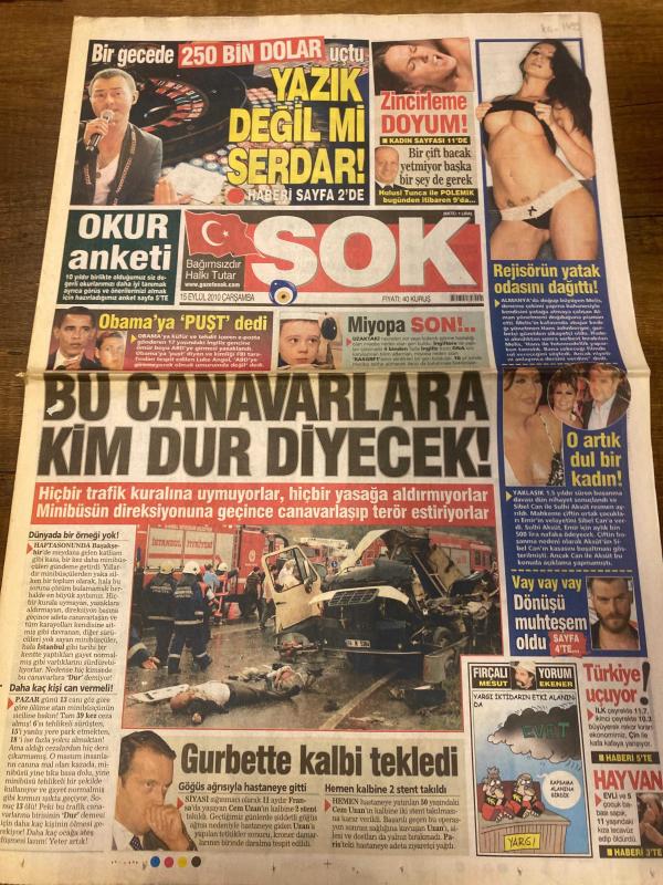 ŞOK GAZETESİ DOĞUM GÜNÜ HEDİYESİ - 15 EYLÜL 2010 - TAM TAKIM 12 SAYFADIR -Serdar Ortaç-Ebru Polat-Hüsnü Tunca-Ali Babacan-Cem Uzun-Cem Uzun-Alişan-Kenan Doğulu-Tarkan-Hülya Avşar-Gülben Ergen-Yüksel Yeşilova-Murat Yeşilova-Onur-Süreyya Serter-Emma Watson-Kıvanç Tatlıtuğ-Eva Maya-Yaprak Dökümü Halil Ergün-Güven Hokna-Bennu Yıldırımlar-Furkan Kızılay-Pınar Altuğ-Tamer Karadağlı-Hayal Kahraman-Zerrin Gökgüçlü-Okan Tok-Recep Tayyip Erdoğan-Kaan Özbek Bir gecede 250 bin dolar uçtu-Yazık değil mi Serdar-Bu canavarlara kim dur diyecek-Gurbette kalbi tekledi-250 bin dolar bir gecede gitti-Havyan-Oğlumun karısına tecavüze yeltendi-Kurban-Kilitlendi-Türkiye uçuyor-Başbakan’ım bizi unutma Fırçalı Mesut-Yorum Kenar adlı eser, Kitap > Süreli Yayınlar > Gazeteler > Türkiye > Genel > Günlük kategorisinde İkinci El olarak satıştadır.
