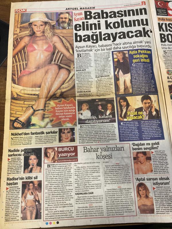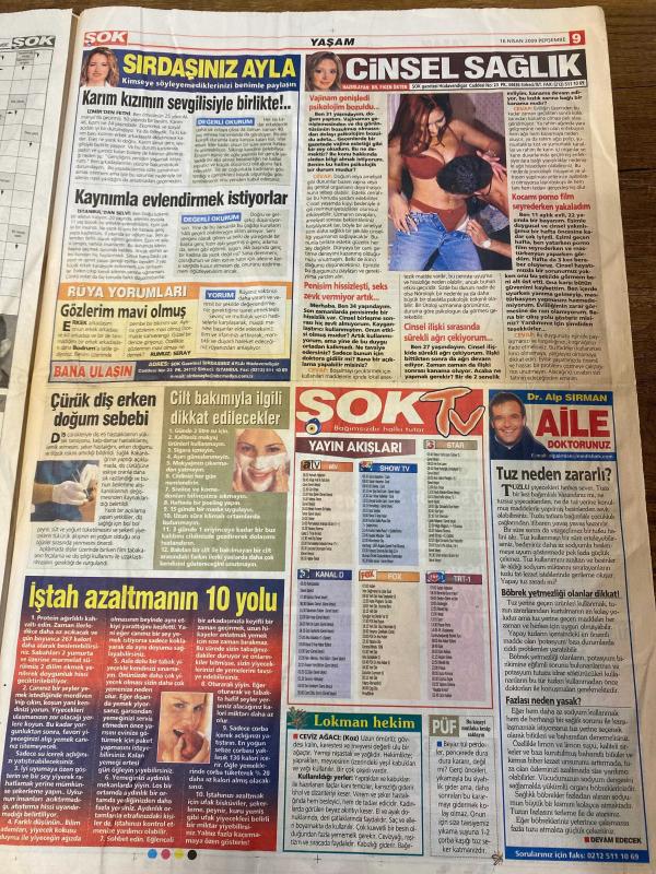 ŞOK GAZETESİ DOĞUM GÜNÜ HEDİYESİ - 16 NİSAN 2009 - TAM TAKIM 12 SAYFADIR -Saba Tümer-Aysun Kayacı-Ajda Pekkan-Nükhet Duru-Nadide Sultan-Hadise-Hüseyin Avuç-Cüneyt Cesur-Najda Benaissa-Tarkan-Leonardo DiCaprio-Ayşe Arman-Kutsi-Ebru Gündeş-Tark Akan-Hakan Peker-Funda Arar-Reyhan Karaca-Uğur Batur-Berna Laçin-Alışık ailesi-Mustafa Keser-Gül Gölge-Güner Ümit-Emine Ülker Tarhan-Nurettin Hasman-Burcu Esmersoy-Demet Akalın-Gülben Ergen-Kenan Doğulu-Sezen Aksu-Buket Aras-Kutsi-Eren Talu-Hakan Şükür-Ajda Pekkan-Mustafa Arık-Burcu Kırca-Hüseyin Avuç- Bir jigolonun anıları-İlişkiyi reddeden eşini sokak ortasında dövdü-Bodrum yanıyor-Artık güneş yakmayacak-Süper savcı eski görevine döndü-İnternette aşk olmaz seks olur-Vişne suyu mucizesi-Öğretmenin aşk üçgeni kanlı bitti-Ünlü popçu bilerek AIDS bulaştırmış-Anne 13 baba 15 yaşında-Maskara oldular-Dellas onun yüzünden Cimbom’a gelmedi-Bir anda kendimi yaşlı ve çirkin kadınların koynunda buldum-Aysun Kayacı babasının elini kolunu bağlayacak-Nükhet’t adlı eser, Kitap > Süreli Yayınlar > Gazeteler > Türkiye > Genel > Günlük kategorisinde İkinci El olarak satıştadır.