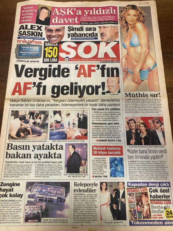ŞOK GAZETESİ DOĞUM GÜNÜ HEDİYESİ - 20 HAZİRAN 2004 - TAM TAKIM 12 SAYFADIR -Kemal Unakıtan-Alex de Souza-Nijer Tailson-Duvaras Kara-Yonca Ceylan-Madonna-Britney Spears-Ronaldo-Carlos Cordoba-Vicente del Bosque-Fatih Sonkaya-Ali Güneş-Gökhan Zan-İsmet Taşdemir-Önder Turacı-Flavio Conceiçao-Emre Belözoğlu-Trapattoni-Özcan Deniz-Davut Güloğlu-Yasemin Kozanoğlu-Bülent Şakrak-Serhat-Mehdi Kurcaoğlu-Şennur Sezen Vergide affın af’ı geliyor-Basın yatakta bakan ayakta-Zengine hayat çok kolay-Kelepçeyle evlendiler-Babalar ne ister?-Ronaldo hiç kaçırır mı?-Striptiz yaptı hayatı kaydı-Hooijdonk’u geçerim-Bosque umut saçtı-Alex salladı-Şampiyonluğa geliyorum-Trapattoni bizi yaktı-Özcan’da pişti Davut’a düştü-Bu albüme ulaşmalı-Para kavgası-At koşar mafya kazanır-İnternetten cızzz-Hortum faciası-TEM sular altında-Serhat nefes almak zor adlı eser, Kitap > Süreli Yayınlar > Gazeteler > Türkiye > Genel > Günlük kategorisinde İkinci El olarak satıştadır.