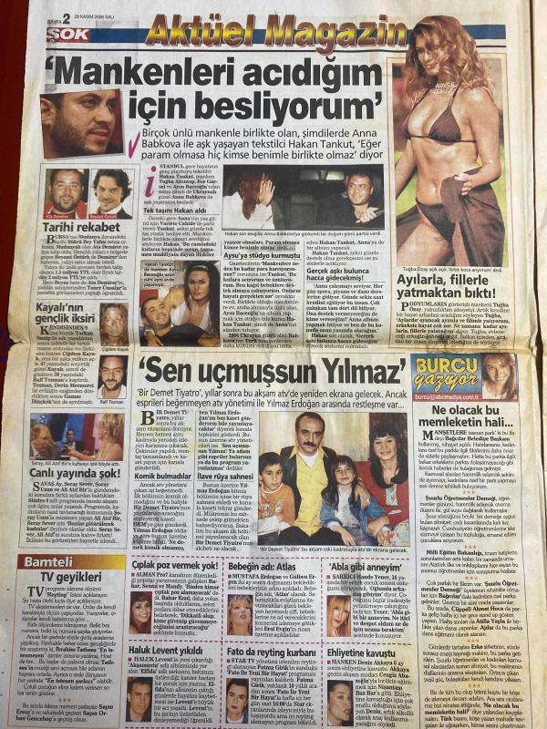 ŞOK GAZETESİ DOĞUM GÜNÜ HEDİYESİ - 28 KASIM 2006 - TAM TAKIM 12 SAYFADIR -Hakan Tankut-Anna Babkova-Tuğba Özay-Yılmaz Erdoğan-Haluk Levent-Mustafa Erdoğan-Gülben Ergen-Sarıgül Dilek-Yıldız Tilbe-Sezen Aksu-Siren Ertan-Ralf Temam-Ayşe Sılay-Fato-Ayşegül Yalçın-Ersin Tilki-Hatice Topuzelli-Boyge Gürkey Her 4 saatte 1 kişi öldürülüyor-Mankenleri acıdığım için besliyorum-Ayılarla filllerle yatmaktan bıktım-Sen uçmuşsun Yılmaz-Türkiye vahşi batı gibi oldu-Akdeniz güneşi hala yakıyor-İşte TIK sermaye-Hangi kanal Yılmaz Erdoğan’a Sen uçmuşsun dedi-Rum ne yapacağını şaşırdı Türk domatesine savaş açtı-Soyunmayı seviyor-Elbise aynı numaralı farklı-Heves hırkalarla yer değiştirdi-Erotik takvimli yardım-Yakarım ben bu otomobili-Amâ koca eşini satırla doğradı-Makyajlı kumarhane-Otomobil şimdi alınır-Ortalık kızıştı-Yıldız adayları, Mustafa küçük tarafından kaleme alınmıştır. Kitap ABC Medya Ajansı tarafından yayınlanmıştır. 12 sayfadır. ŞOK GAZETESİ DOĞUM GÜNÜ HEDİYESİ - 28 KASIM 2006 - TAM TAKIM 12 SAYFADIR -Hakan Tankut-Anna Babkova-Tuğba Özay-Yılmaz Erdoğan-Haluk Levent-Mustafa Erdoğan-Gülben Ergen-Sarıgül Dilek-Yıldız Tilbe-Sezen Aksu-Siren Ertan-Ralf Temam-Ayşe Sılay-Fato-Ayşegül Yalçın-Ersin Tilki-Hatice Topuzelli-Boyge Gürkey Her 4 saatte 1 kişi öldürülüyor-Mankenleri acıdığım için besliyorum-Ayılarla filllerle yatmaktan bıktım-Sen uçmuşsun Yılmaz-Türkiye vahşi batı gibi oldu-Akdeniz güneşi hala yakıyor-İşte TIK sermaye-Hangi kanal Yılmaz Erdoğan’a Sen uçmuşsun dedi-Rum ne yapacağını şaşırdı Türk domatesine savaş açtı-Soyunmayı seviyor-Elbise aynı numaralı farklı-Heves hırkalarla yer değiştirdi-Erotik takvimli yardım-Yakarım ben bu otomobili-Amâ koca eşini satırla doğradı-Makyajlı kumarhane-Otomobil şimdi alınır-Ortalık kızıştı-Yıldız adayları adlı eser Türkçe dilindedir.