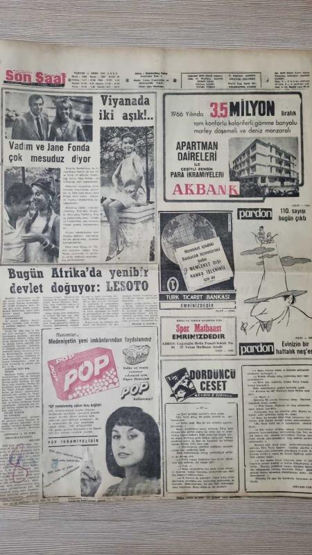 SON SAAT GAZETESİ -- 4 EKİM 1966 -- GAZANFER ÖZCAN VE GÖNÜL ÜLKÜ 'SÜLÜMAN BACANAK ' PROVASINDA ' E. KÖSEOĞLU , TEVFİK GELENBE , ZİYA KESKİNER , SELİM NAŞİT , ŞENİZ GÜZENDOR , ADİLE NAŞİT , GÜLER ALIŞ -- KÜÇÜK SAHNENİN YENİ KURUCUSU M. OFLUOĞLU -- İNGİLTERE DE TİYATRO ŞİRİN DEVRİM -- BEŞİKTAŞ İÇİN EN UZUN GÜN YARIN - K. AHMET , HAYATIMIN OUNUNU UYNYACAĞIM -- LOKOMATİV, GALATASARAY I 85-71 YENDİ VE ŞAMPİYON OLDU -- FAİK HOCA ANTRENÖR OLDU --ROGER VADİM VE JANE FONDA ÇOK MESUDUZ DİYOR -- TARIK BİNAT, ŞEHİR TİYATROLARI -- 181 MUSEVİ MİLLİ SAVUNMANIN TEKLİFİ ÜZERİNE TÜRK VATANDAŞLIĞINDAN ATILDI -- BEYAZ PERDENİN BÜYÜK ANNESİ MARLENE DİETRLEH --