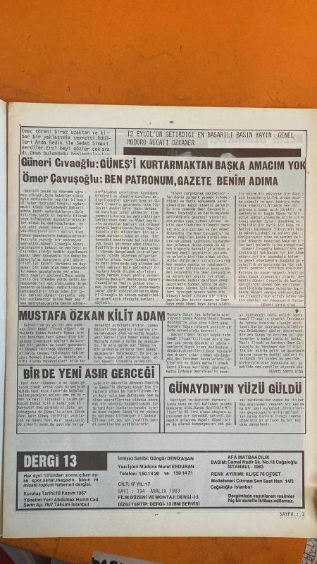 SOSYETE 13 DERGİSİ - 13 ARALIK 1983 - AHMET KOZANOĞLU - GÜNERİ CİVAOĞLU - SUMA-GAN - İNAN KIRAÇ - VEHBİ KOÇ - ARDA GEDİK - SEDAT SİMAVİ - EROL SİMAVİ - NECATİ ÖZKANER - ÖMER ÇAVUŞOĞLU - MUSTAFA ÖZKAN - MEHMET OKUMUŞ - KEMAL ILICAK - ERDOĞAN DEMİRÖREN - NAZLI ILICAK - MEHMET ALİ YILMAZ - AHMET SUAT ÖZYAZICI - ÖZKAN SÜMER - GÜNERİ CİVAOĞLU VE GÜNEŞ’TE SAHİPLİK KRİZİ - KOÇ HOLDİNG 20. YILINI KUTLADI - VEHBİ KOÇ VE İNAN KIRAÇ’IN KULÜP BAŞKANLIĞI İDDİASI - NECATİ ÖZKANER’İN 12 EYLÜL SONRASI BASIN BAŞARISI - MUSTAFA ÖZKAN VE YENİ GÜNEŞ PROJESİ - YENİ ASIR’IN İSTANBUL’A GELİŞ SENARYOLARI - KEMAL ILICAK VE TERCÜMAN TESİSLERİ HAKKINDA DEDİKODULAR - GÜNAYDIN'IN HÜRRİYET DAĞITIM KRİZİNİ FIRSATA ÇEVİRMESİ - MEHMET ALİ YILMAZ’IN GÜNEŞ GAZETESİ SAHİPLİĞİ - BABIALİ’DE MEDYA SAHİPLİĞİ VE YÖNETİMDE GÜÇ DENGELERİ - 28 SAYFA adlı eser Türkçe dilindedir.