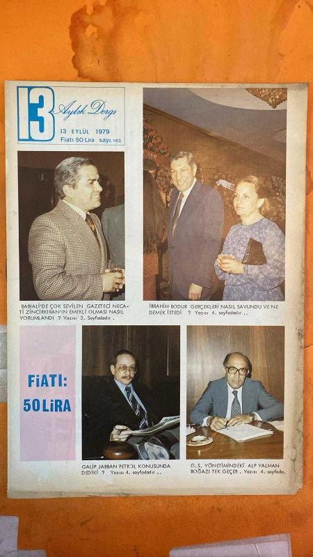 SOSYETE 13 DERGİSİ - 13 EYLÜL 1979 NECATİ ZİNCİRKIRAN – HALDUN SİMAVİ – İBRAHİM BODUR – GALİP JABBAN – ALP YALMAN – SEMİH TÜRKDOĞAN – ERDOĞAN ARIPINAR – RAHMİ TURAN – AYDIN ÖZTÜRK – BEYHAN CENKÇİ – BURHAN FELEK – MUSTAFA YÜCEL – MURAT SERTOĞLU – NAZIM HİKMET – MÜNÜR BEY – KORUTÜRK – EVREN PAŞA NECATİ ZİNCİRKIRAN’IN EMEKLİLİĞİ – BABIALİ TİRAJ SAVAŞLARI – GÜNAYDIN’IN YENİ YAYIN MODELİ – CUMHURİYET’İN SATIŞ DÜŞÜŞÜ – BEYHAN CENKÇİ VE GAZETECİLER CEMİYETİ – İBRAHİM BODUR’UN EKONOMİ AÇIKLAMALARI – ALP YALMAN VE GALATASARAY YÖNETİMİ – GALİP JABBAN’DAN PETROL VE ENERJİ SORUNLARINA YANIT – TÜRKİYE’NİN TARIM VE SANAYİ DENGESİ – MEDYA, POLİTİKA VE ENFLASYON TARTIŞMALARI - 18 SAYFA