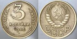 SOVYETLER BİRLİĞİ 3 KAPİK 1946. İKİNCİ DÜNYA SAVAŞI STALİN DÖNEMİ. CCCP SSCB RUSYA ORAK ÇEKİÇ. NADİR