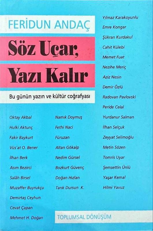 SÖZ UÇAR YAZI KALIR, FERİDUN ANDAÇ tarafından kaleme alınmıştır. Kitap TOPLUMSAL DÖNÜŞÜM tarafından 975-7244-54-3 ISBN kodu ile yayınlanmıştır. 564 sayfadır. SÖZ UÇAR YAZI KALIR adlı eser Türkçe dilindedir.