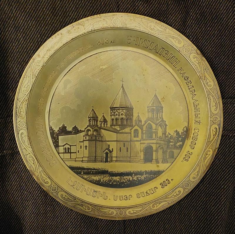 SSCB/Armenia, "Eçmiadzin Katedrali 303" Temalı Dekoratif Tepsi/Tabak. Ermenistan'da Eçmiadzin ve Vagharshapat Olarak da Bilinen Şehirde Bulunan Ermeni Apostolik Kilisesi'nin Ana Kilisesidir. Sıklıkla Dünyanın En Eski Katedrali Olarak Görülür. Kullanılmış/Yaşlanma Belirtileriyle Birlikte İyi Durumda. Ayakta-Duvarda Sergilemeye Uygundur. (Orta: Sol Üstte Minik Bir Hasar Bulunmaktadır.) Zarif Patinalı Haliyle. 1970'ler-80'ler. Pirinç. (28,5 cm)