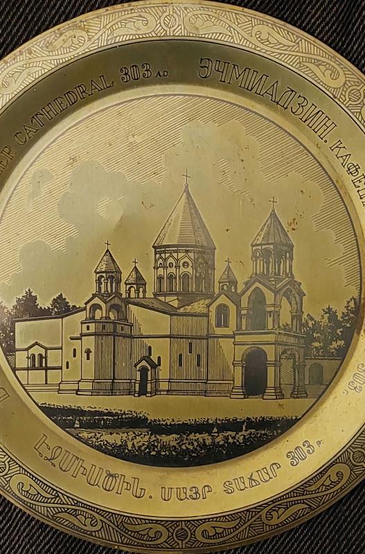 SSCB/Armenia, "Eçmiadzin Katedrali 303" Temalı Dekoratif Tepsi/Tabak. Ermenistan'da Eçmiadzin ve Vagharshapat Olarak da Bilinen Şehirde Bulunan Ermeni Apostolik Kilisesi'nin Ana Kilisesidir. Sıklıkla Dünyanın En Eski Katedrali Olarak Görülür. Kullanılmış/Yaşlanma Belirtileriyle Birlikte İyi Durumda. Ayakta-Duvarda Sergilemeye Uygundur. (Orta: Sol Üstte Minik Bir Hasar Bulunmaktadır.) Zarif Patinalı Haliyle. 1970'ler-80'ler. Pirinç. (28,5 cm), 12 saat önce kitantik’te satışa sunulmuştur.
