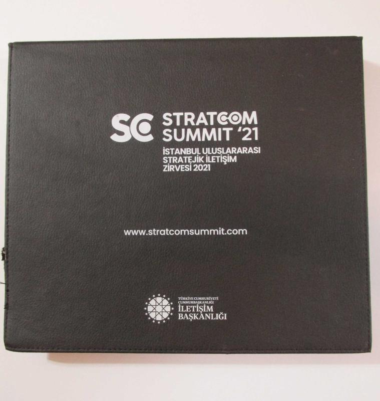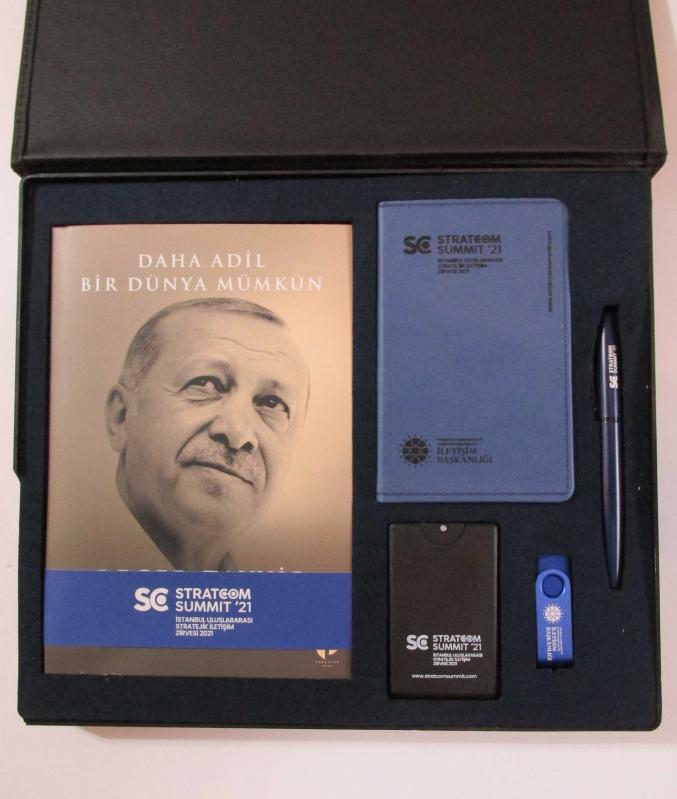 STRATCOM Summit '21 İst. Uluslararası Stratejik İletişim Zirvesi 2021 SETİ Ciltli ve Şömizli Recep Tayyip Erdoğan Daha Adil Bir Dünya Mümkün Kitabı 32 GB Flash Disk Kalem Not Defteri Parfüm Özel Kutusunda Kutunun bir köşesi hafif hasarlı.