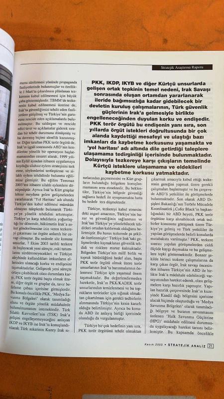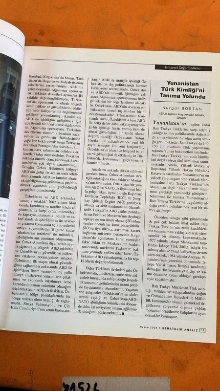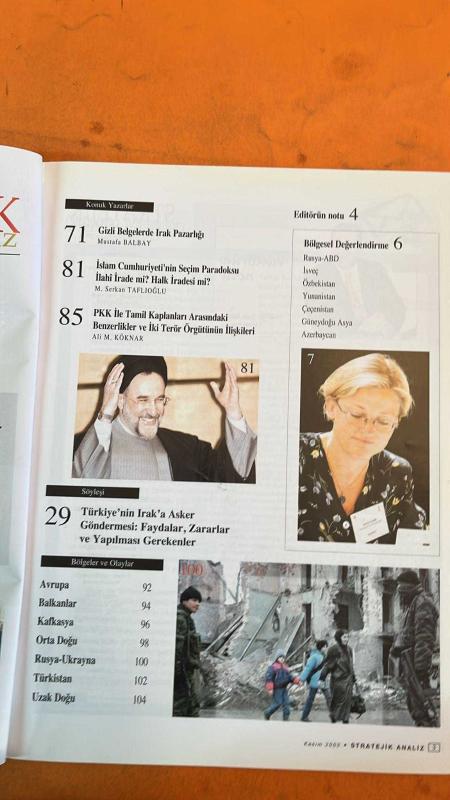 Kitap DİNÇBİLGİN tarafından yayınlanmıştır. 106 sayfadır. STRATEJİK ANALİZ DERGİSİ - KASIM 2003 - IRAK’IN GİZLENEN GERÇEĞİ: TÜRKMENLER – ALPER ŞEN – IRAK’TA PROPAGANDA SAVAŞI – NAZİM CAFERSOY – RUSYA’DA JEOPOLİTİK MODEL ARAYIŞI – BİROL AKGÜN – AMERİKA’NIN YENİ DÜNYA VİZYONU – ŞANLI BAHADIR KOÇ – TÜRK-AMERİKAN İLİŞKİLERİ – AYŞE ÖZKAN – ERHAN TÜRBEDAR – NURGÜL BOSTAN – AMERİKA-AVRUPA BİRLİĞİ AYRIŞMASI VE BALKANLAR – GÖKÇEN EKİCİ – IRAK KAFKASYA’YA EMSAL OLABİLİR Mİ – MINE – OKUYUCU MESAJLARI – YASİN ATLIOĞLU – STRATEJİ: YARIN BİLİMİ – ÜMİT ÖZDAĞ – HASAN YILMAZ – KUZEY KORE KRİZİ VE ÇİN’İN ROLÜ – ERKİN EKREM – KAFKASYA JEOPOLİTİĞİ – AYŞEN ATASİR – KÜRESEL YANSIMALAR – BİROL AKGÜN - 106 SAYFA adlı eser Türkçe dilindedir.