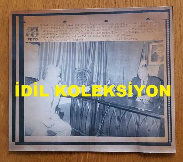 SÜLEYMAN DEMİREL ve ŞEVKET YILMAZ'IN HABER METİNLİ AJANS-BASIN FOTOĞRAFI (KAĞIT BASKI) - 21 x 19 cm EBADINDA - TÜRK-İŞ GENEL BAŞKANI ŞEVKET YILMAZ, DYP GENEL BAŞKANI SÜLEYMAN DEMİREL'LE KARŞILIKLI GÖRÜŞÜRKEN ÇEKİLMİŞ BİR KARE. 1989, 7 gün önce satışa sunulmuştur.