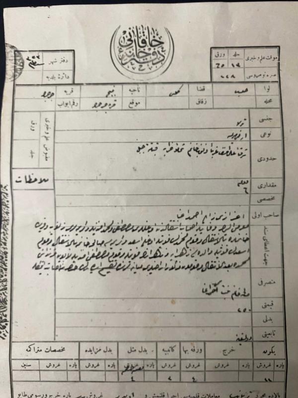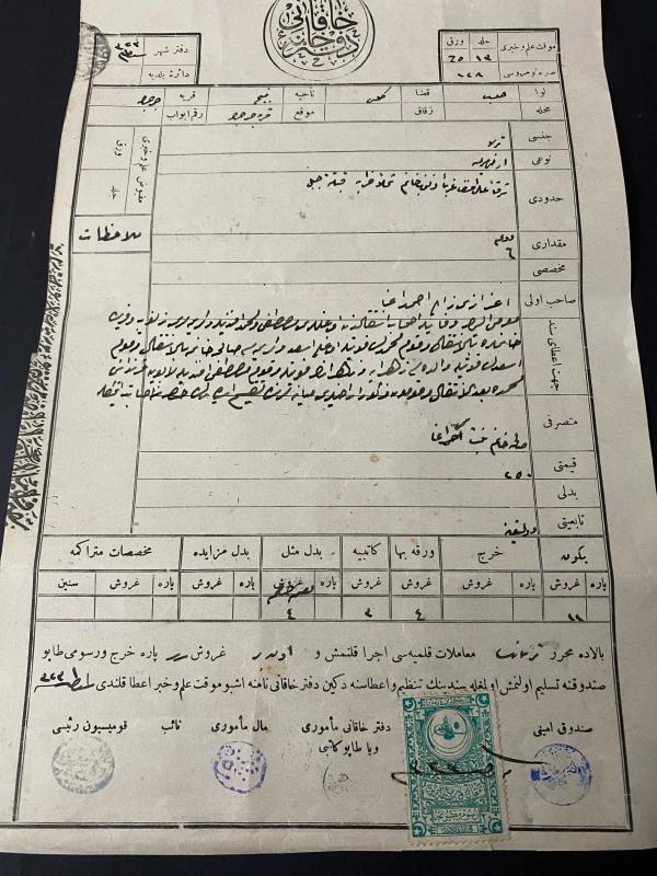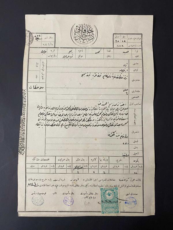 Osmanlı İmparatorluğu’nun son dönemine, 1910 yılı Sultan Reşad (V. Mehmed) dönemi Halep Sancağı’na bağlı Kilis Kazasındaki zeytinliğe ait “muvakkat ilmuhaberi” (geçici tapu). . Kilis, o dönemde idari olarak Halep’e bağlıydı. 1918’deki I. Dünya Savaşı sonrasındaki işgallerden önce, yani bölgenin henüz tam bir Osmanlı idari yapısında olduğu bir dönemde hazırlanmış olan resmi evrak. . Miras yoluyla babadan evlada geçen bir zeytinliğin hazırlanmış olan resmi pullu, damgalı imzalı muvakkat ilmuhaberi.
