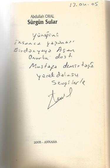 SÜRGÜN SULAR (İTHAFLI İMZALI), ABDULLAH ORAL tarafından kaleme alınmıştır. Kitap 2005 yılında TÜRK HALK OZANLARI DERNEĞİ tarafından [ANKARA] yayınlanmıştır. 112 sayfadır. SÜRGÜN SULAR (İTHAFLI İMZALI) adlı eser Türkçe dilindedir.