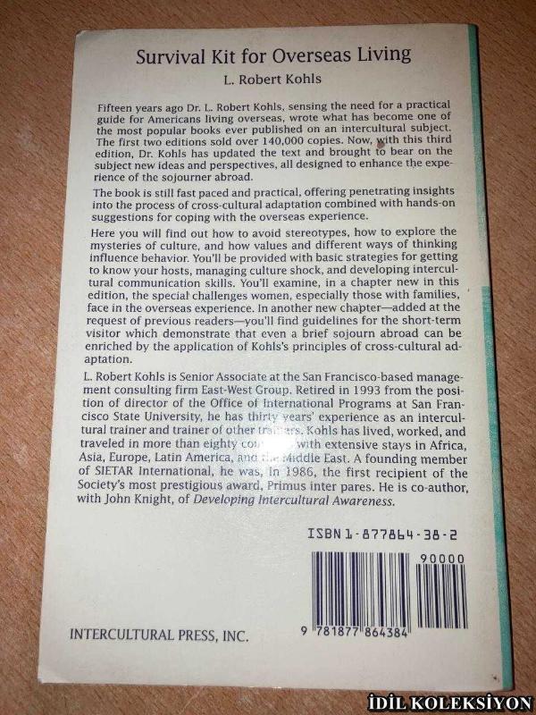 SURVİVAL KİT FOR OVERSEAS LİVİNG : FOR AMERİCANS PLANNİNG TO LİVE AND WORK ABROAD / L. ROBERTS KOHL / INTERCULTURAL PRESS / İNGİLİZCE KİTAP (YURTDIŞINDA YAŞAMAK İÇİN HAYATTA KALMA KİTİ: YURTDIŞINDA YAŞAMAYI VE ÇALIŞMAYI PLANLAYAN AMERİKALILAR İÇİN), L. ROBERTS KOHL tarafından kaleme alınmıştır. Kitap 1984 yılında INTERCULTURAL PRESS tarafından [U.S.A] yayınlanmıştır. 165 sayfadır. SURVİVAL KİT FOR OVERSEAS LİVİNG : FOR AMERİCANS PLANNİNG TO LİVE AND WORK ABROAD / L. ROBERTS KOHL / INTERCULTURAL PRESS / İNGİLİZCE KİTAP (YURTDIŞINDA YAŞAMAK İÇİN HAYATTA KALMA KİTİ: YURTDIŞINDA YAŞAMAYI VE ÇALIŞMAYI PLANLAYAN AMERİKALILAR İÇİN) adlı eser İngilizce dilindedir.