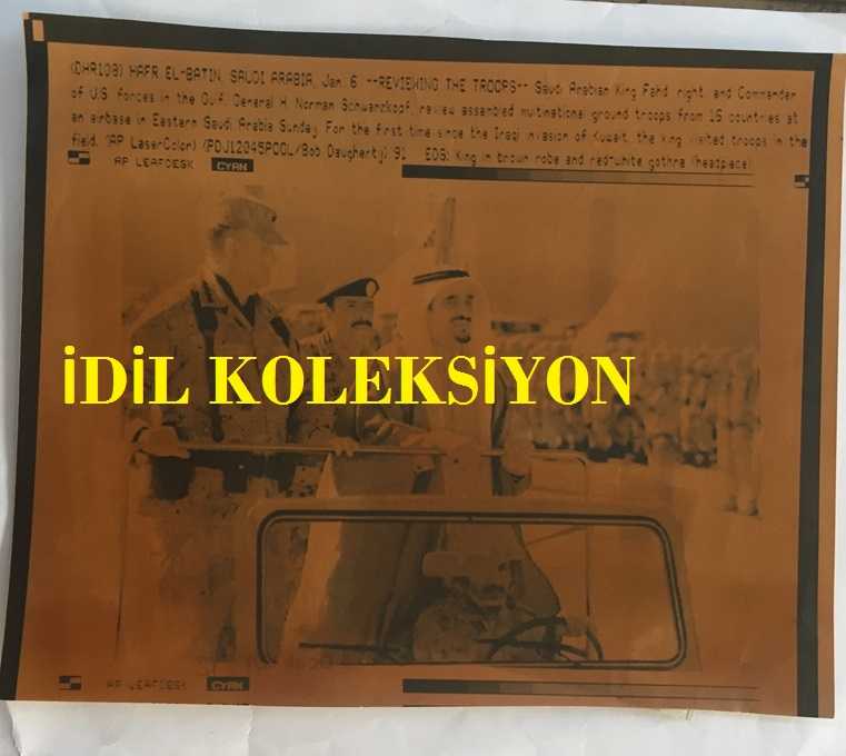 SUUDİ ARABİSTAN KRALI FAYSAL BİN ABDÜLAZİZ'İN ORİJİNAL AJANS BASIMI FOTOĞRAFI (KAĞIT BASKI, HABER METİNLİ) - 21 x 18 cm EBADINDA - PRENS FAYSAL BİN ABDÜLAZİZ AMERİKALI GENELRA NORMAN SCHWARZKOPF'LA ASKERİ ARAÇTA GEÇİT TÖRENİ YAPARKEN, 7 ay önce satışa sunulmuştur.