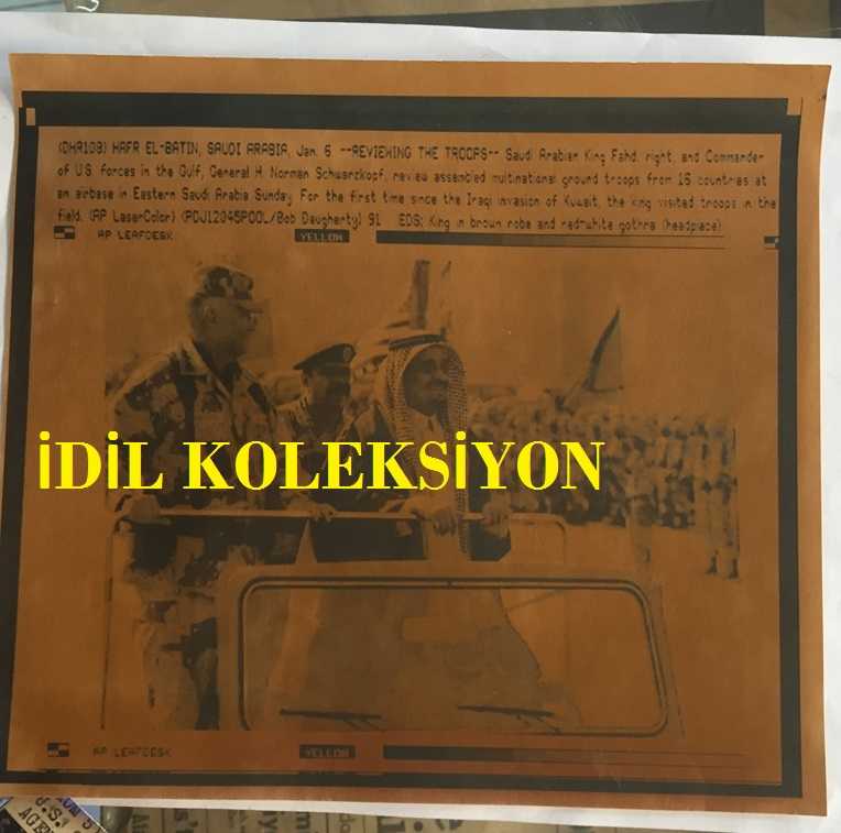 SUUDİ ARABİSTAN KRALI FAYSAL BİN ABDÜLAZİZ'İN ORİJİNAL AJANS BASIMI FOTOĞRAFI (KAĞIT BASKI, HABER METİNLİ) - 21 x 18 cm EBADINDA - PRENS FAYSAL BİN ABDÜLAZİZ AMERİKALI GENELRA NORMAN SCHWARZKOPF'LA ASKERİ ARAÇTA GEÇİT TÖRENİ YAPARKEN, 7 ay önce satışa sunulmuştur.