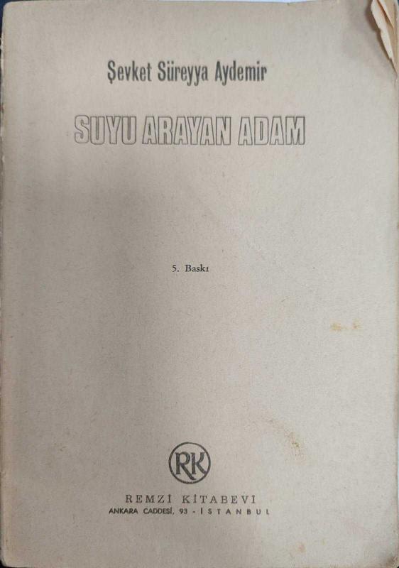 SUYU ARAYAN ADAM, ŞEVKET SÜREYYA AYDEMİR tarafından kaleme alınmıştır. Kitap 1993 yılında REMZİ KİTABEVİ tarafından [İSTANBUL ] yayınlanmıştır. 526 sayfadır. SUYU ARAYAN ADAM adlı eser Türkçe dilindedir.