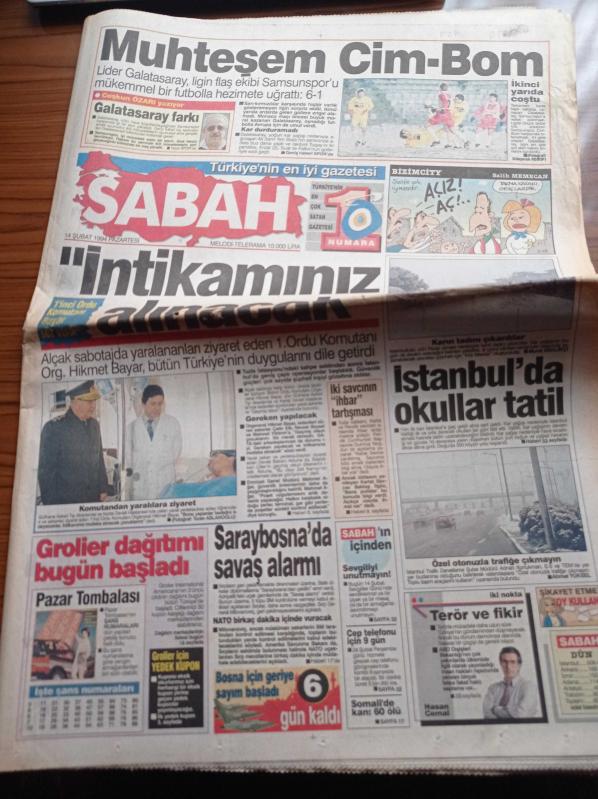 Sabah Gazetesi - 14 Şubat 1994 - Galatasaray'dan Ankaragücü'ne Teşvik Primi İddiası - Coşkun Özarı - 1. Ordu Komutanı Orgeneral Hikmet Bayar İntikamınız Alınacak - Tuzla Katliamı Üzerinden İki Savcının İhbar Tartışması - Saraybosna'da Savaş Alarmı - İstanbul'da Okullar Tatil adlı eser Türkçe dilindedir.