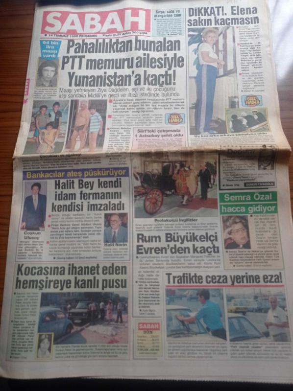 Sabah Gazetesi - 14 Temmuz 1988 - Beşiktaş Kalecisi Zalad Bana Şikeci Diyen Allahsızdır - Gönül Yazar'ın Bilinmeyen Yılları Yazı Dizisi - Fenerbahçe Eski Başkanı Tahsin Kaya Beni Sırtımdan Vurdular - Rum Büyükelçi Kenan Evren'den Kaçtı - Halit Narin Kendi İdam Fermanını Kendisi İmzaladı - Semra Özal Hacca Gidiyor adlı eser Türkçe dilindedir.