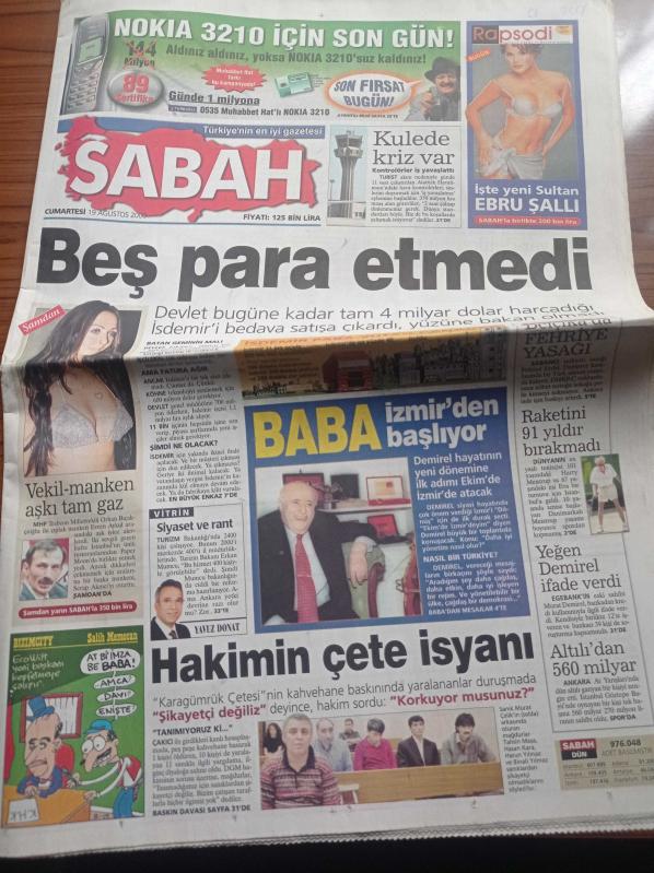 Sabah Gazetesi - 19 Ağustos 2000 - Beşiktaşlı Şifo Mehmet'e Çirkin Saldırı - Belçika Sokaklarında Fehriye Erdal Yasağı - Yeğen Murat Demirel İfade Verdi - MHP Trabzon Vekili Orhan Bıçakçı İle Çıplak Manken Evren Aykul Aşkı Tam Gaz - Devlet İSDEMİR Fabrikasını Satışa Çıkardı - Karagümrük Çetesi - Süleyman Demirel İzmir'den Başlıyor adlı eser, Kitap > Süreli Yayınlar > Gazeteler kategorisinde İkinci El olarak satıştadır.