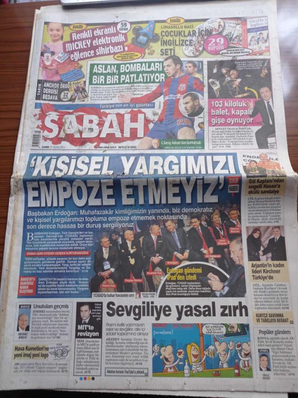Sabah Gazetesi - 21 Ocak 2011 - 103 Kiloluk Balet Alper Kara Kapalı Gişe Oynuyor - Cem Yılmaz Biletleri Karaborsada - Galatasaray Bombaları Bir Bir Patlatıyor - Stancu - Başbakan Recep Tayyip Erdoğan Kişisel Yargımızı Empoze Etmeyiniz - Rahmi Koç - Mustafa Koç - Ali Babacan - Ümit Boyner - Hakan Fidan - Abdullah Gül adlı eser Türkçe dilindedir.