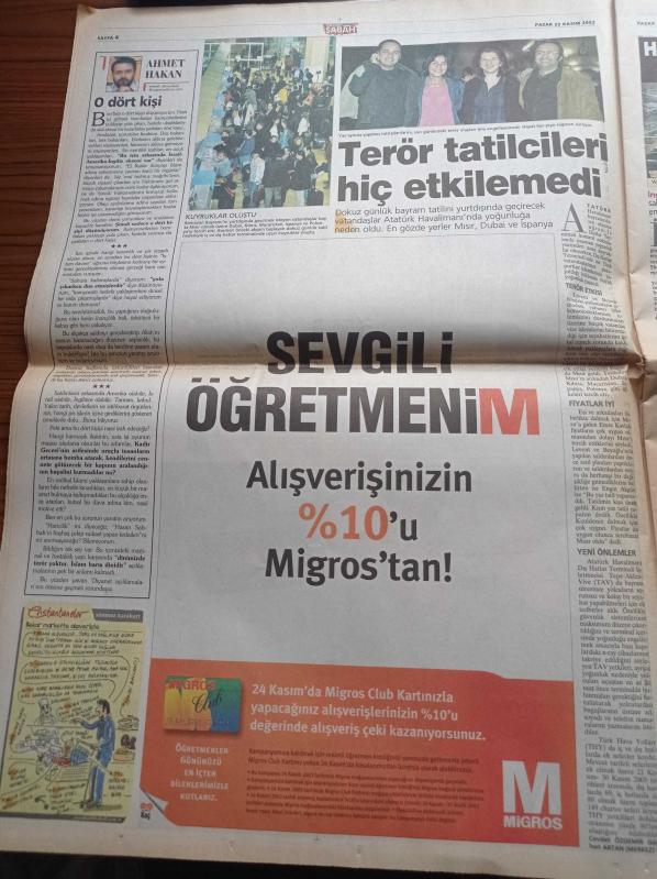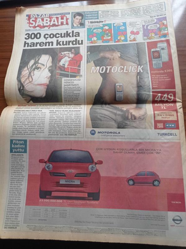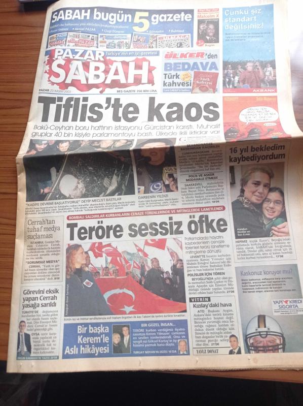 Sabah Gazetesi - 23 Kasım 2003 - Ömer Çelik - Mehmet Barlas - Ahmet Hakan - Michael Jackson 300 Çocukla Harem Kurdu- Fenerbahçe'de Ortega'ya Güvenoyu - Galatasaray Tatilde - Bakü Ceyhan Boru Hattının İstasyonu Gürcistan'ı Karıştırdı - Teröre Sessiz Öfke İstanbul Emniyet Müdürü Celalettin Cerrah'tan Tuhaf Medya Suçlaması - Teröre Kurban Verdiğimiz Tiyatro Sanatçısı Kerem Yılmazer - Göksel Kortay adlı eser Türkçe dilindedir.