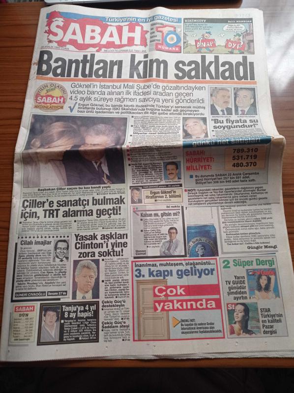 Sabah Gazetesi - 24 Aralık 1993 - Uzay Takımı Galatasaray - Galatasaray Başkanı Alp Yalman - Tugay Kerimoğlu - Polis Michael Jackson'ı Çırılçıplak Soydu - Ergun Göknel'in İtiraflarının 2. Bölümü - Tansu Çiller'e Sanatçı Bulmak İçin TRT Alarma Geçti - Tanju Çolak'a 4 Yıl 8 Ay Hapis - Yasak Aşkları Bill Clinton'ı Zora Soktu - Bedrettin Dalan - Nurettin Sözen - İSKİ Skandalı adlı eser, Kitap > Süreli Yayınlar > Gazeteler kategorisinde İkinci El olarak satıştadır.