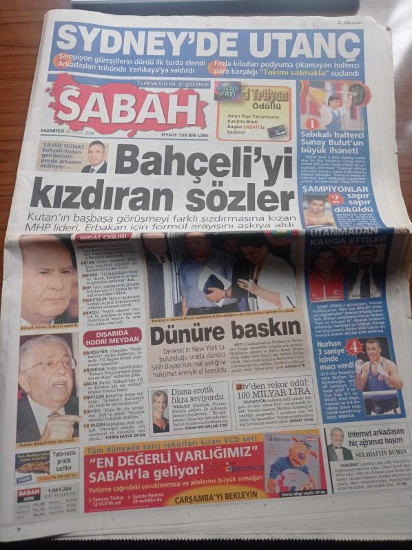 Sabah Gazetesi - 25 Eylül 2000 - Can Bartu - Hami Mandıralı - Kenneth Anderson - Sydney'de Utanç Dopingli Halterciler - Nurhan Süleymanoğlu - Hamza Yerlikaya'ya Saldırı - Devlet Bahçeli'yi Kızdıran Sözler - Recai Kutan- Rauf Denktaş'ın Dünürüne Baskın adlı eser Türkçe dilindedir.