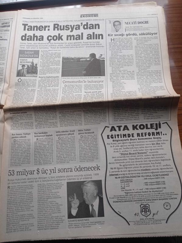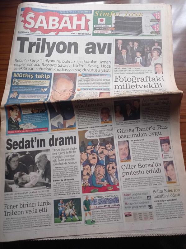 Sabah Gazetesi - 26 Ağustos 1998 - Alparslan Türkeş'in Sırları Yazı Dizisi - Trabzonspor UEFA'ya Erken Veda Etti - Fenerbahçe Göteborg'u Eledi - Elvir Baliç - Victoria's Secret - Arzum Onan - Mehmet Aslantuğ - Refah Partisi'nin Kayıp 1 Trilyonu Bulmak İçin Uzman Ekip Kuruldu - Fazilet Partisi Lideri Recai Kutan - Yeraltı Dünyasının 80'li Yıllardaki Etkili İsmi Bekir Çelenk - Güneş Taner'e Rus Basınından Övgü adlı eser Türkçe dilindedir.